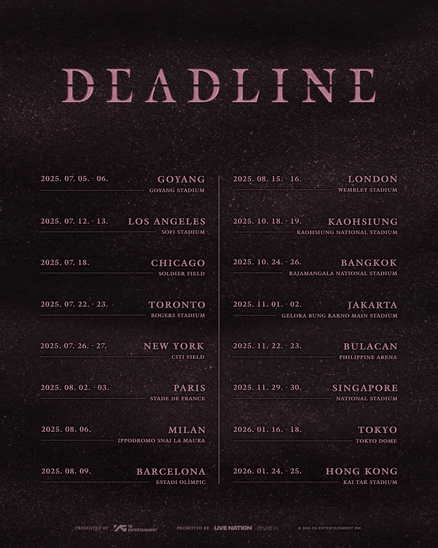 儘管爭議不斷,「DEADLINE」巡演仍勢不可擋,BLACKPINK接下來將橫跨亞洲、歐洲與北美,共走訪16座城市、舉辦31場大型演出,包括洛杉磯、紐約、巴黎、東京、新加坡、香港與台灣高雄等國際大城,所選場館皆為體育場等級規模,證明她們在全球音樂市場的無與倫比影響力。