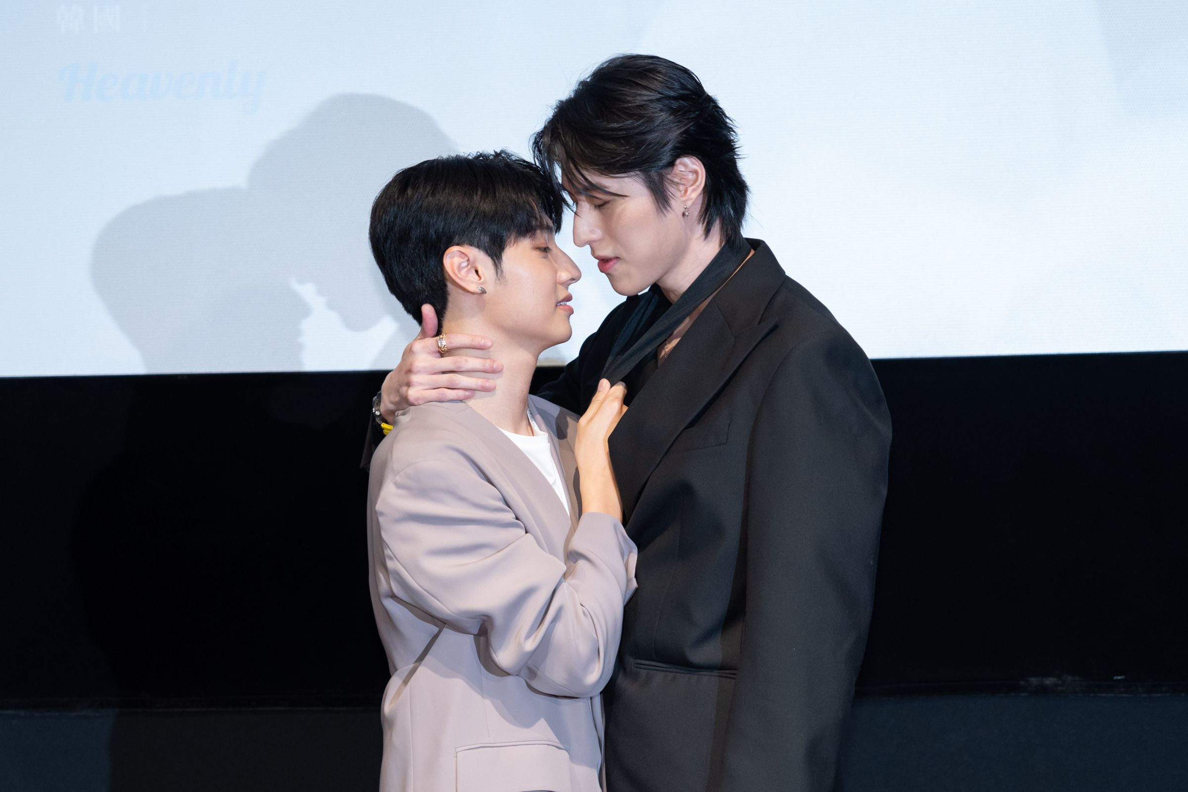 記者會由「夫夫之道」阿凱、里歐主持,劇組特別準備了恐龍造型蛋糕,除慶祝「拓晞CP」的誕生外,也為獻出許多「第一次」的君豪紀念。兩人首集就有戲院廁所熱吻畫面,因為空間狹窄,挑戰很大,另一場是邊親邊旋轉,還有成晞必須單手抱著王君豪接吻的鏡頭,形容挑戰很多親吻極限,甚至「親到嘴唇都乾了」,王君豪笑說:「我會用嘴唇幫成晞上護唇膏。」害羞發言讓現場尖叫連連,成晞則透露:「拍吻戲更像是反射動作,他其實也是我的螢幕初吻。」兩人記者會上黏TT,成晞全程緊勾王君豪,王君豪則親暱摟腰,拍照互動環節,更用領帶拉近距離,差點就吻上去,王君豪害羞直呼:「他有奶香。」