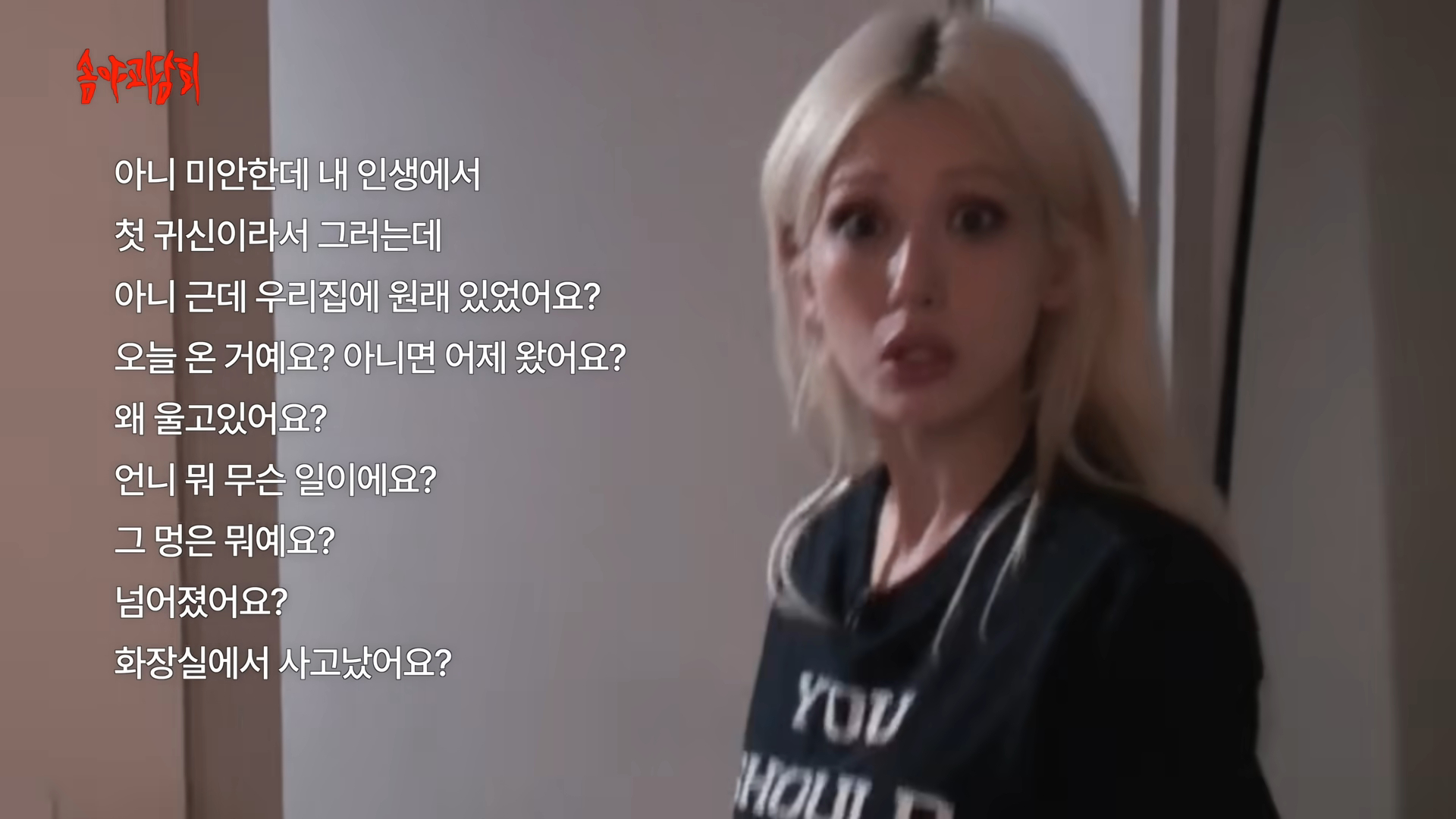 最爆笑的是,Somi竟然不只站著問,還直接坐在浴室門口聽女鬼講心事,還自告奮勇開導對方,甚至忍不住誇讚:「姐姐妳長得真的很漂亮,是那種東方美,漂亮又清新。」話一說完,女鬼還害羞地問:「真的嗎?」畫面讓粉絲笑翻。