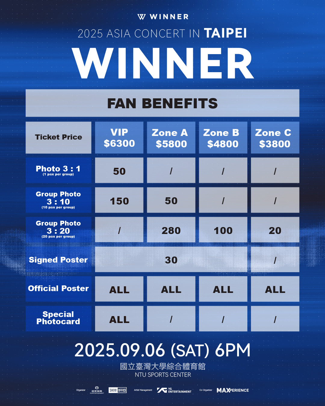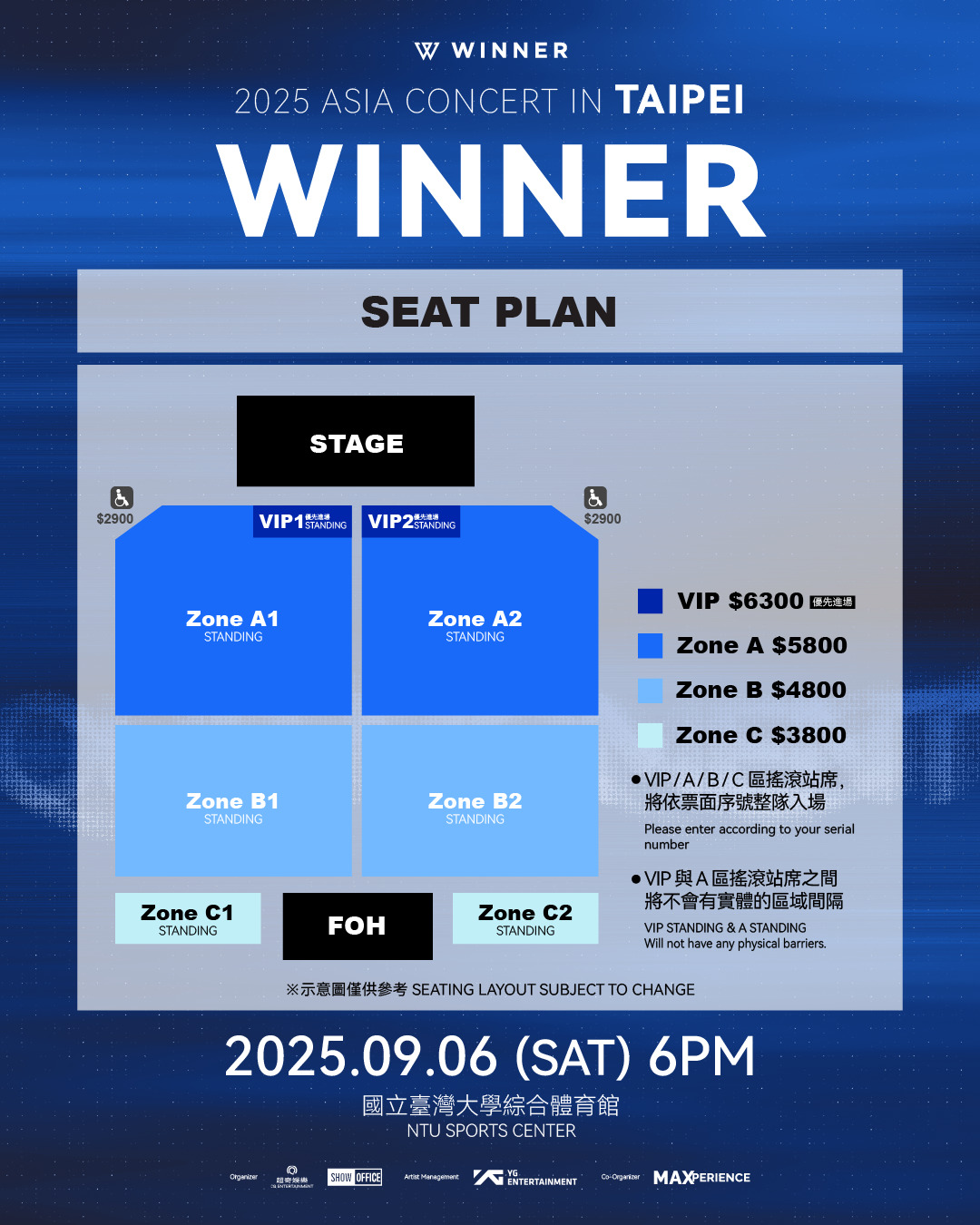 活動票價|VIP NT$6,300(全區站席) / A區 NT$5,800(全區站席) / B區 NT$4,800(全區站席) / C區 NT$3,800(全區站席) / 愛心席NT$2,900