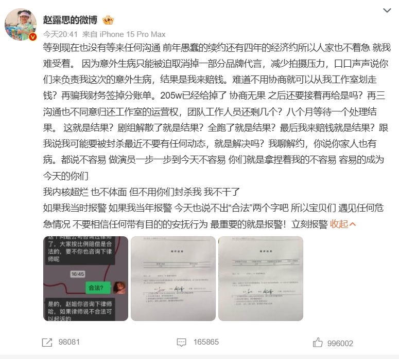 趙露思在文中細數不滿,透露去年身體出狀況後原本期待公司能夠協助處理代言與拍攝問題,沒想到卻變成自己賠錢收場。她指控對方在毫無協商下,擅自從她的工作室帳戶劃走大筆金額,並誘騙財務簽下分帳單,控訴:「205萬(約新台幣800多萬)已經給掉了,之後還要再給,是嗎?」