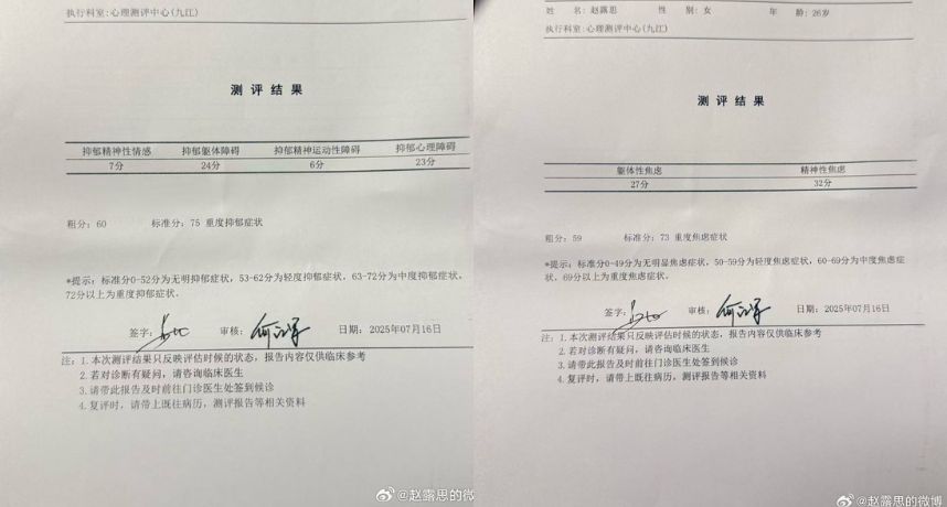 長文最後,趙露思公開了上月16日所做的心理測評,報告中顯示她有「重度焦慮」與「重度憂鬱」症狀。她心痛表示:「如果我當年報警,今天就沒人敢說這叫合法吧!」並語重心長地提醒粉絲們:「遇到危急情況,不要相信任何帶有目的的安撫,最重要的就是報警,立刻報警!」