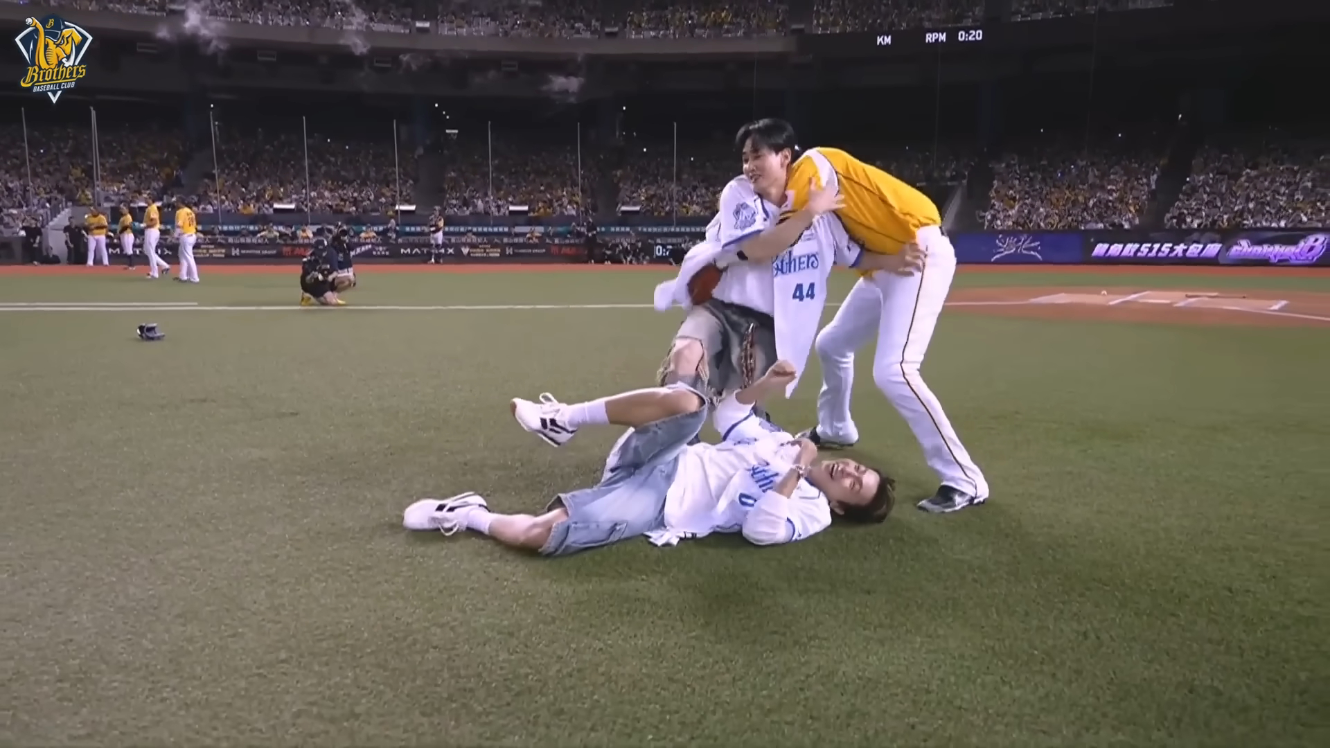 不同於傳統開球方式,D&E這次帶來「一人投球一人打擊」開場秀,東海率先戴上繡有「D&E」字樣的寶藍色手套登上投手丘,銀赫則拿著球棒踏入打擊區,沒想到東海球剛投出便提前落地,銀赫立刻上演爆笑戲碼,裝作被觸身球擊中,怒氣沖沖衝向東海「理論」,兩人直接在場上扭打起來,讓中信兄弟隊長王威晨趕緊跳出來「勸架」,笑翻全場。
