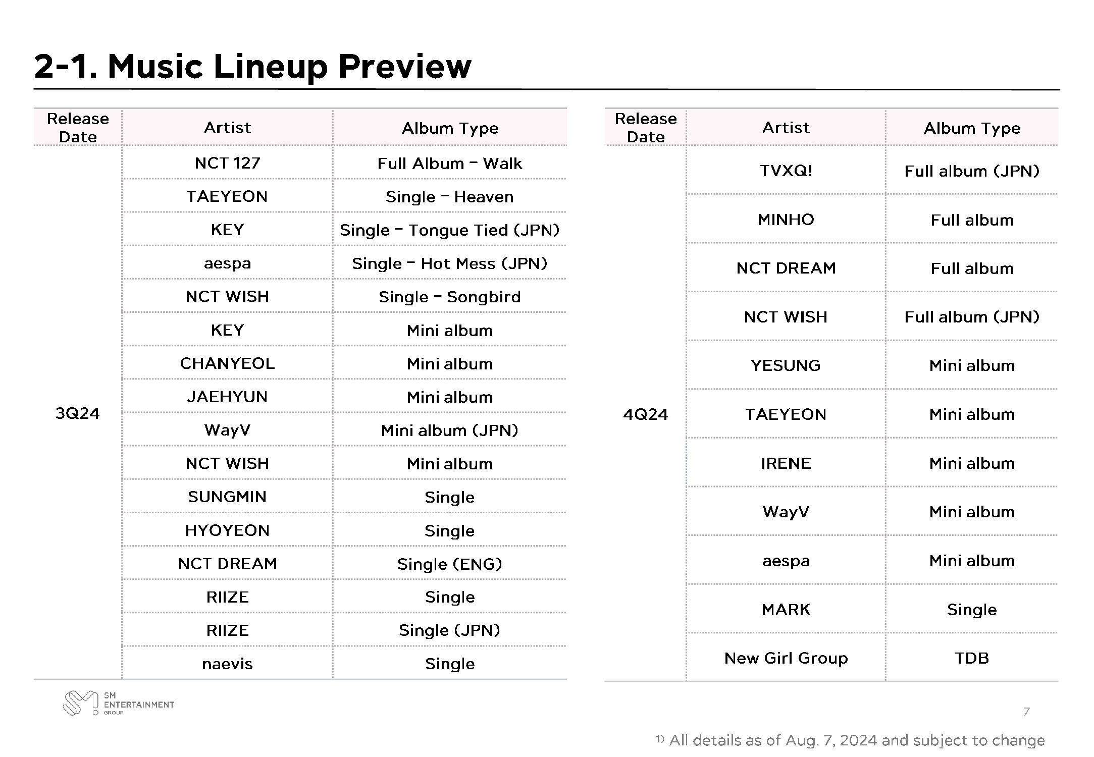 根據報告內容,多數Q3規劃中的作品已如期發行,包括Super Junior、NCT DREAM、WayV等團體皆已推出新作。仍待公開具體時程的則有NCT楷燦、EXO的Suho與燦烈、aespa、NCT WISH等藝人與團體,也讓粉絲倍感期待。