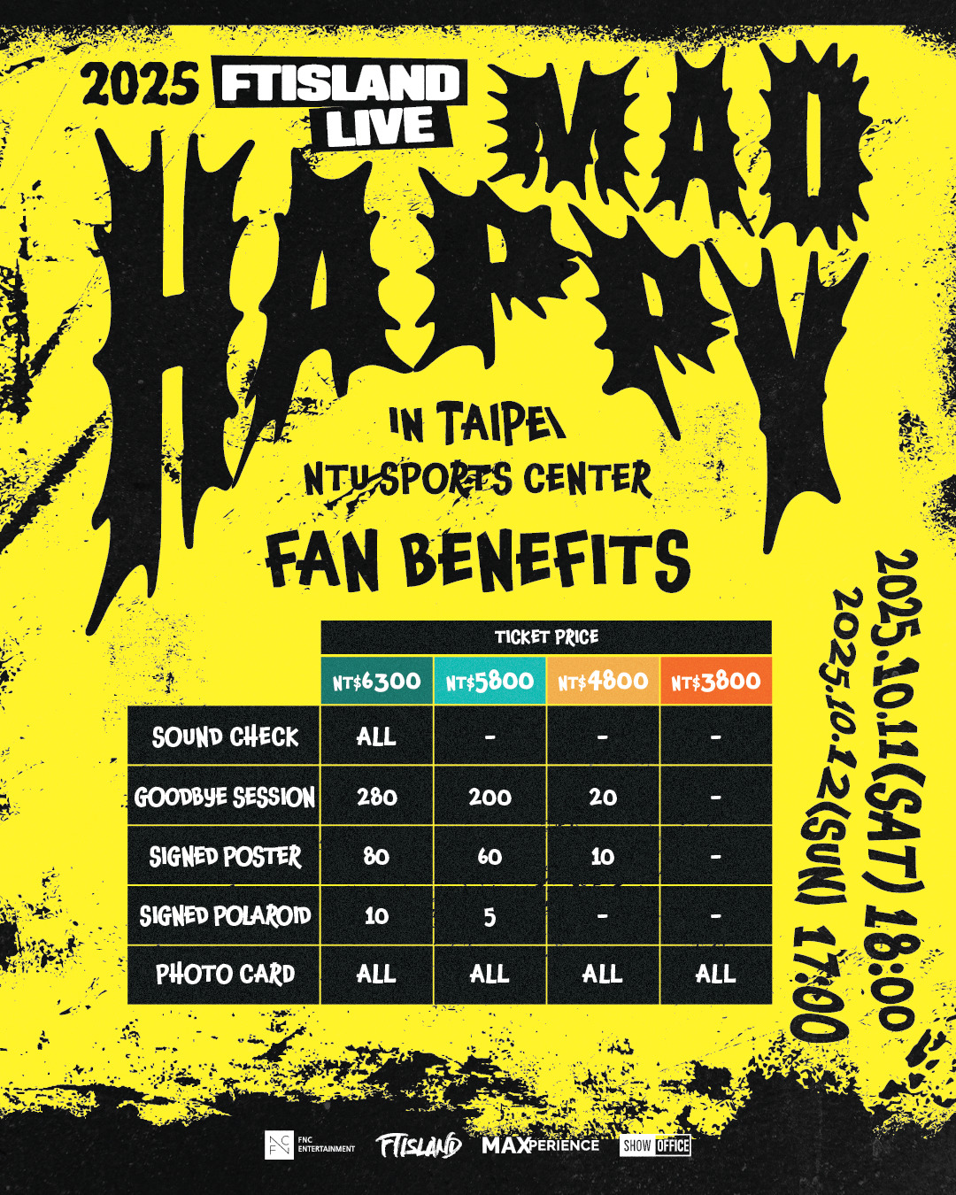 《2025 FTISLAND LIVE ’MAD HAPPY‘ IN TAIPEI》巡演將自8月首爾場起跑,並陸續於澳門、台北、吉隆坡、香港等地登場,準備與亞洲各地的粉絲相見歡。其中台北站也特別規劃連續開唱兩天,同時採取全區站席的設置,希望歌迷都能夠更熱烈地感受FTISLAND最經典的搖滾精神,肯定會讓整個場館熱力全開!