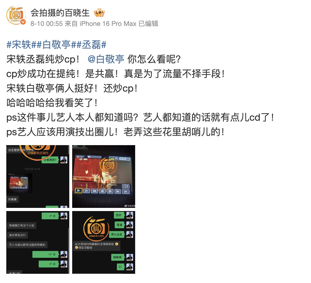 然而,隨後有狗仔爆料並公開多張對話截圖,稱收到《與晉長安》劇組主動聯繫,刻意以「偷拍視角」發布宋軼與丞磊的親密互動,以營造戲劇CP感、為新作預熱。消息曝光後,不少粉絲表示理解炒作宣傳屬常見手法,但仍質疑「有必要自導自演嗎?」。