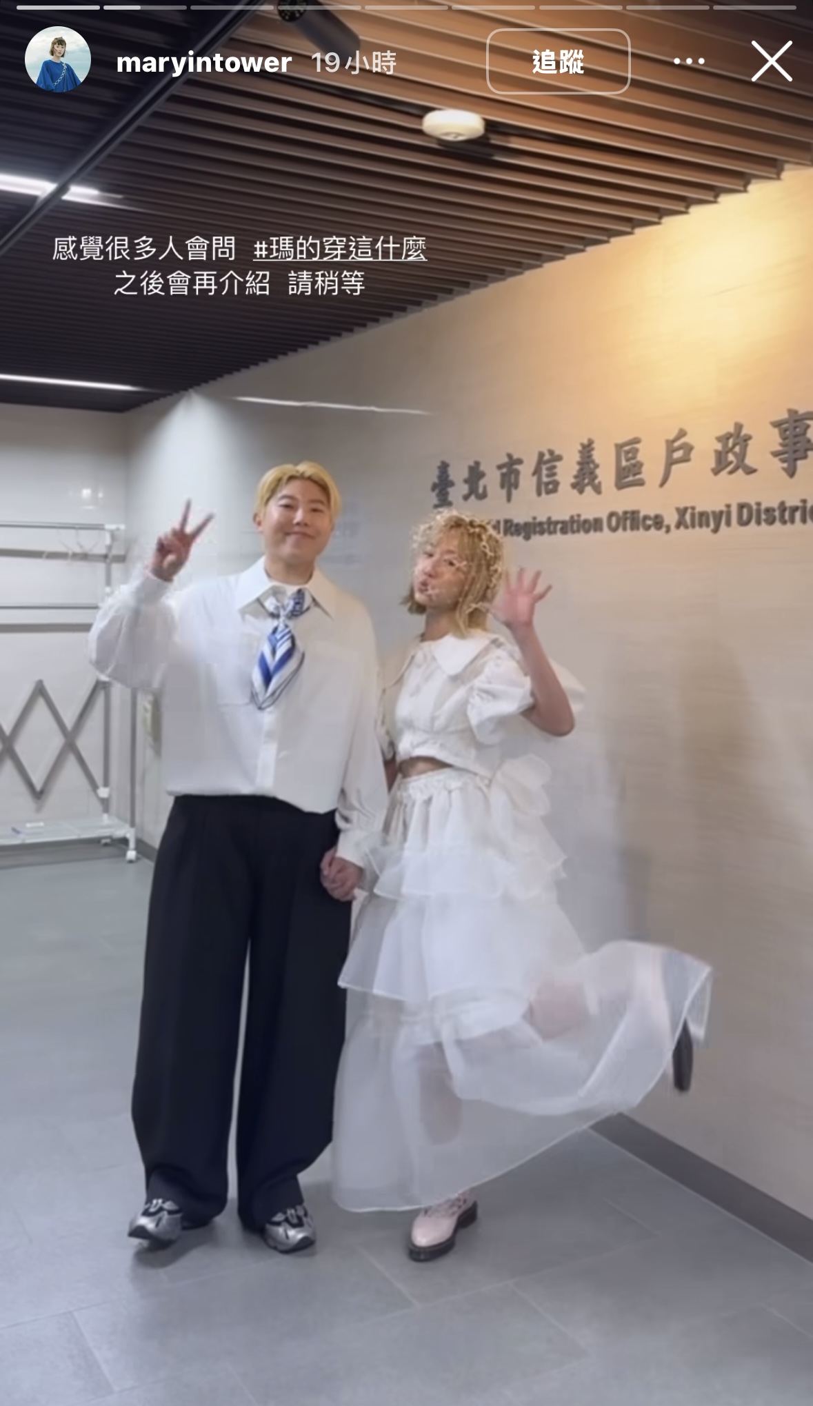 瑪麗與Joy交往近兩年,今年2月曾在社群平台曬出於富士山前拍攝的婚戒照,甜蜜宣告好消息。時隔半年,兩人終於迎來登記日,瑪麗特地身穿改良式婚紗,搭配典雅頭紗,與Joy一同亮相信義區戶政事務所,臉上洋溢著幸福笑容。