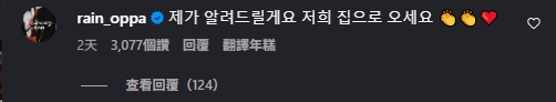 其中一段她拍攝紐約夜景的影片,笑稱自己第一次嘗試上傳影片,不太會調色或加背景音樂。沒想到 Rain 竟跑到留言區甜蜜示愛:「我會告訴妳的,來我家吧❤」,閃光指數爆表,立刻引來粉絲狂刷愛心。
