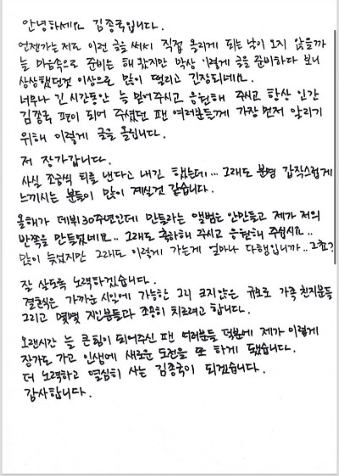 消息曝光後,金鍾國經紀公司也火速證實喜訊,透露婚禮將在首爾舉辦,以非公開形式進行,僅邀請親友出席。金鍾國本人也透過粉絲俱樂部公開親筆信,坦言「緊張到發抖」,並表示選在出道 30 週年的特別年份步入婚姻,「雖未完成新專輯,但找到了人生伴侶」,未來會用心經營家庭。