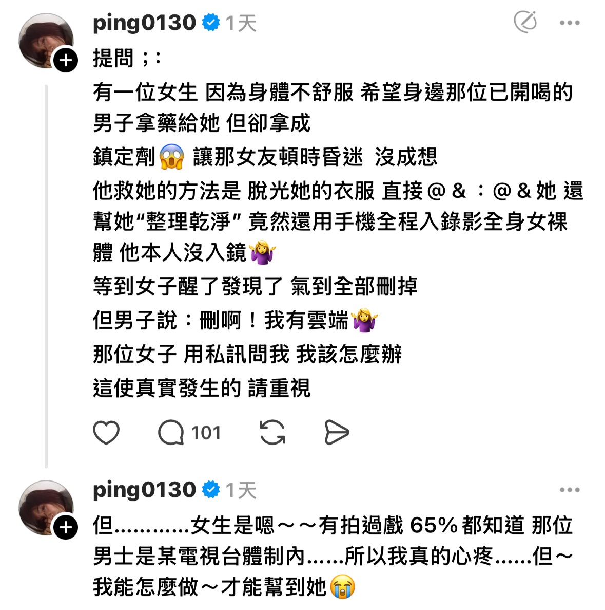 江祖平指出,該名女演員因身體不適,請求一旁喝酒的男子幫忙拿藥,未料對方卻拿來鎮定劑,導致她當場昏迷。更駭人的是,男子竟趁機脫光女子衣物並施暴,還全程用手機錄下過程,但畫面中僅有女子,男子本人並未入鏡。