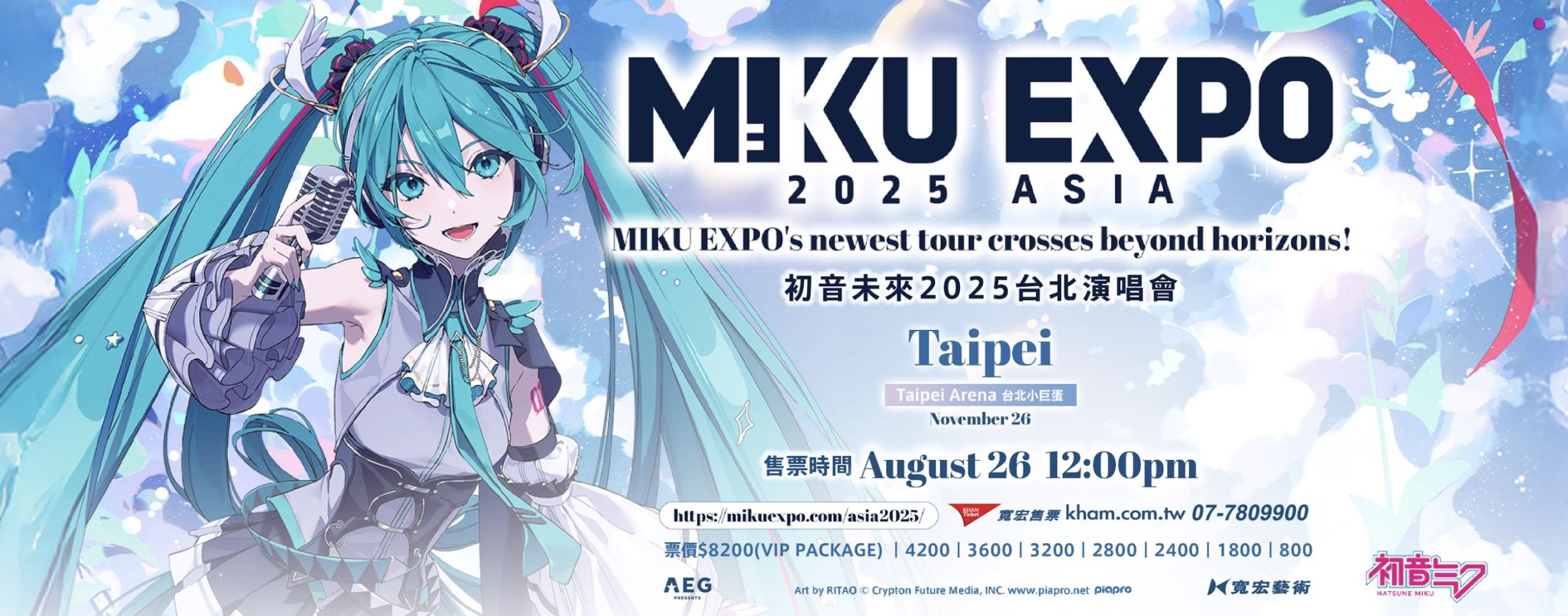 作為亞洲八大城市巡演之一,《HATSUNE MIKU EXPO 2025》台北站將與曼谷、香港、雅加達、馬尼拉、新加坡、吉隆坡、首爾一同見證這場橫跨次元的音樂盛典。本次演出首次登上台北小巨蛋,打造更大規模、更震撼的未來舞台,呈現超越現實與虛擬的音樂空間,與現場觀眾真實互動,展現次世代音樂體驗的無限可能。