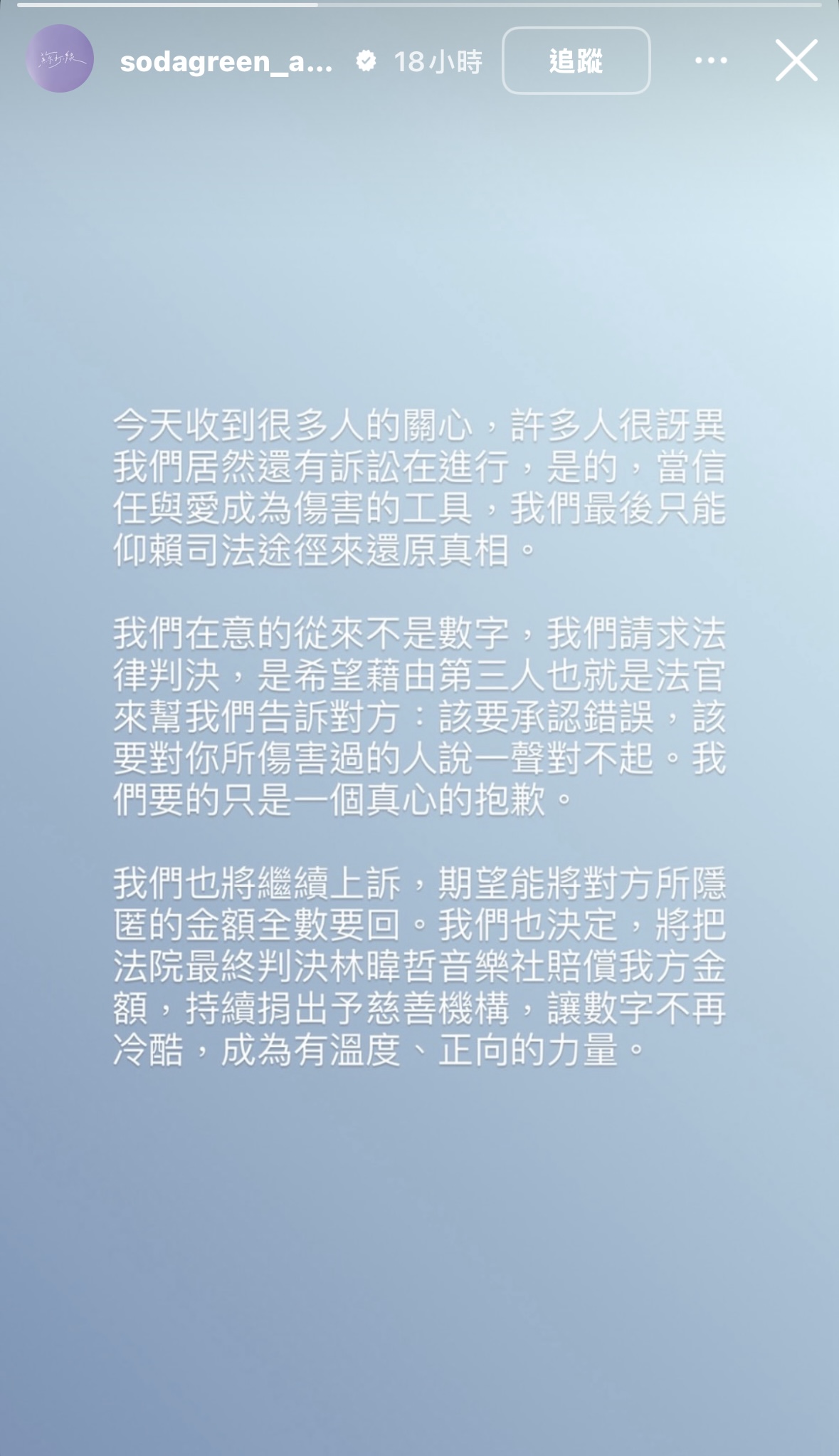 蘇打綠也透露將會持續上訴,爭取追回對方隱匿的款項,「我們也決定,將把法院最終判決林暐哲音樂社賠償我方金額,持續捐出予慈善機構,讓數字不再冷酷,成為有溫度、正向的力量。」