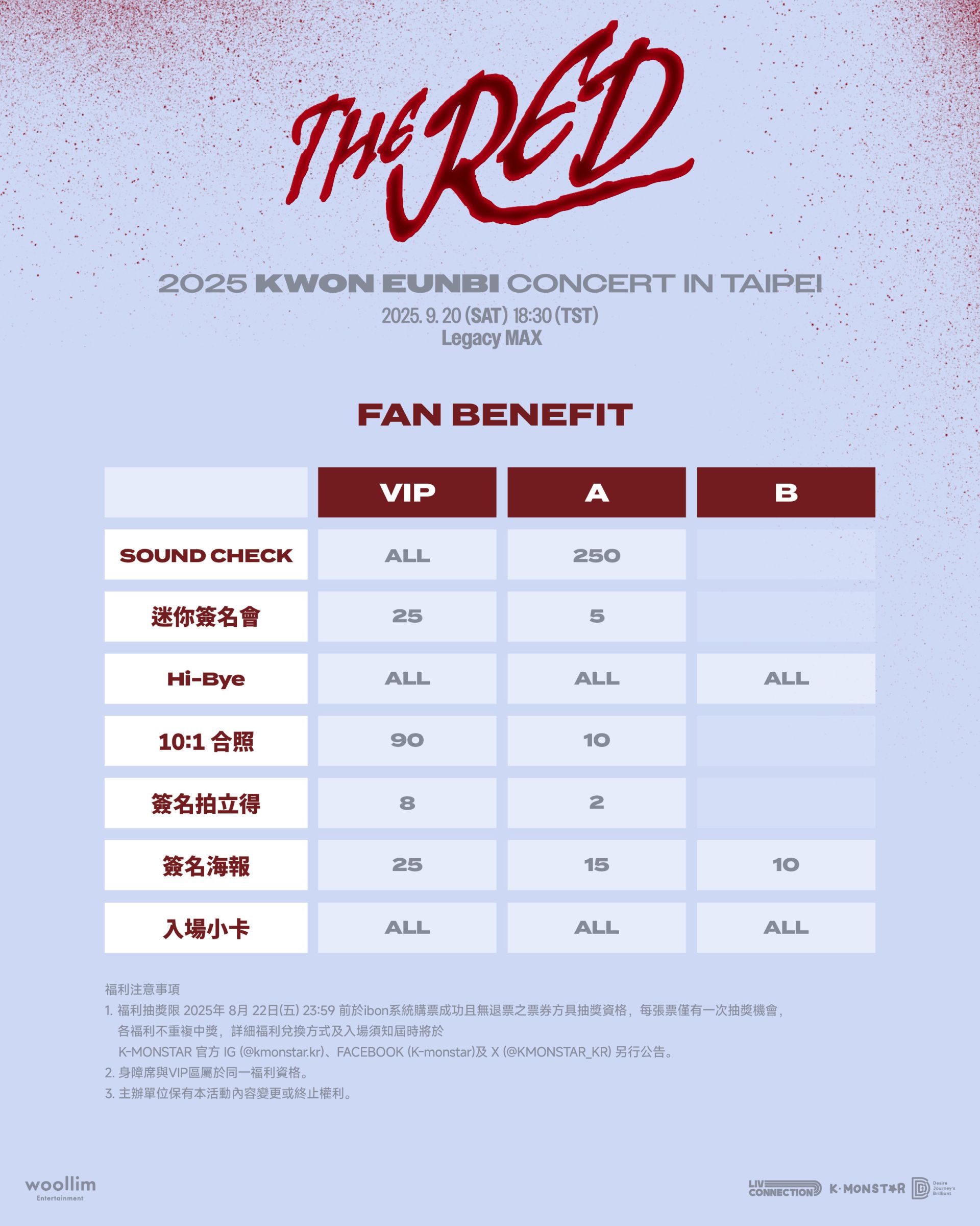 《KWON EUNBI THE RED CONCERT in TAIPEI》演唱會,權恩妃不僅將帶來最具代表性的舞台演出,也特別準備了多項寵粉福利,包括限定小卡、簽名會、SOUND CHECK、10:1合照、Hi-BYE、簽名拍立得與簽名海報等多重驚喜。不同票區的觀眾將有機會抽中不同類型的福利,讓粉絲能近距離感受她的親和力與舞台魅力。而權恩妃也向台灣粉絲表達心意,表示這一次不僅準備了許多豐富的舞台表演,還設計了能和粉絲們一起享受的特別環節,希望能與台灣的RUBI(官方粉絲名)一起創造難忘的回憶。演唱會門票購票方式為全台7-ELEVEN ibon機台及ibon網站,敬請歌迷把握機會,與「水彈女王」權恩妃共度最熱力四射的夜晚!更多活動詳情請上主辦單位K-MONSTAR官方社群查詢。