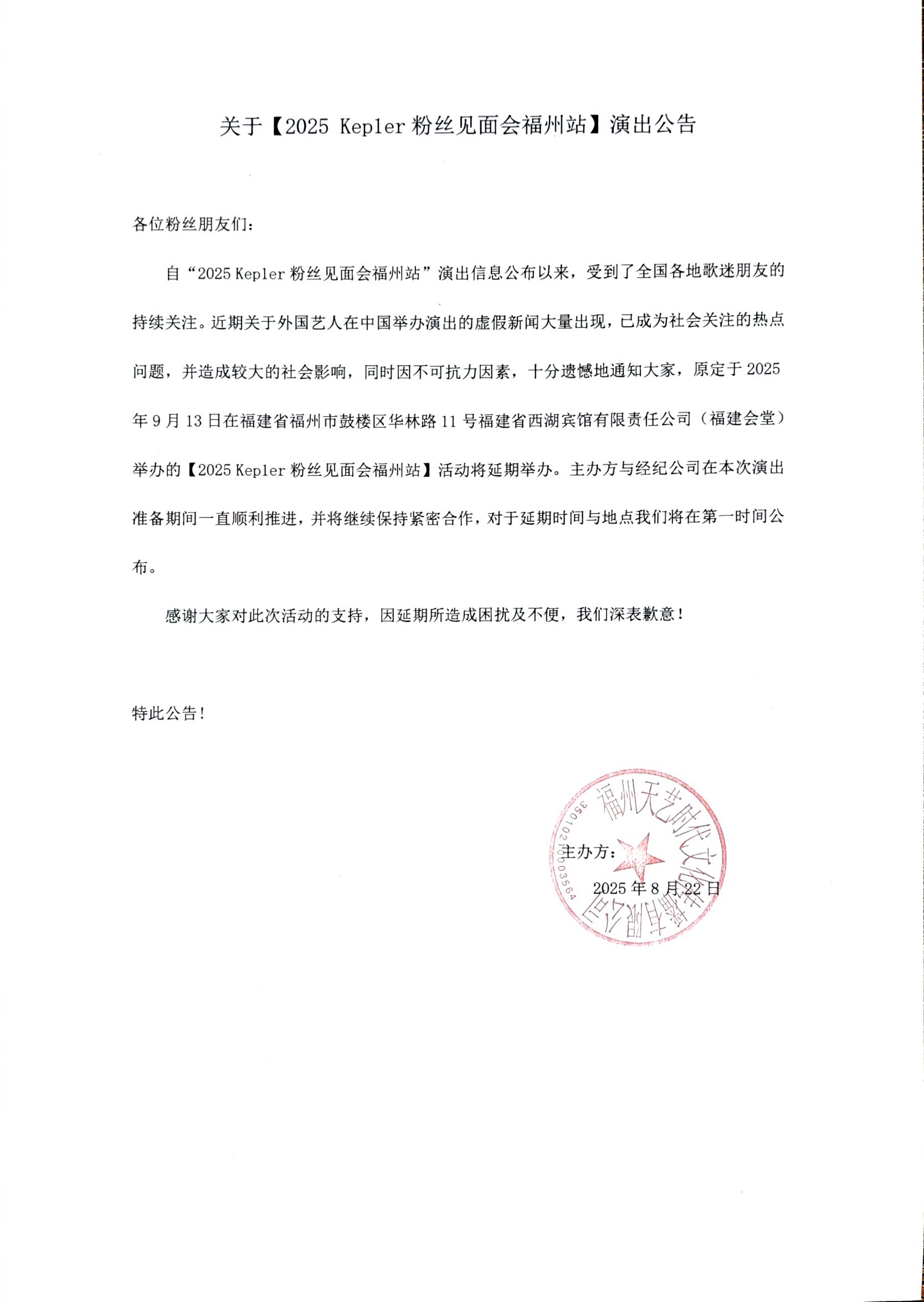 此外,Kep1er 原定於 9 月 13 日在中國福州舉辦粉絲見面會,原本被視為「限韓令鬆動」的訊號,象徵韓團進軍中國的重要風向標。然而,公司今日宣布「因當地不可避免的情況」延期舉辦,讓粉絲期待再度落空。