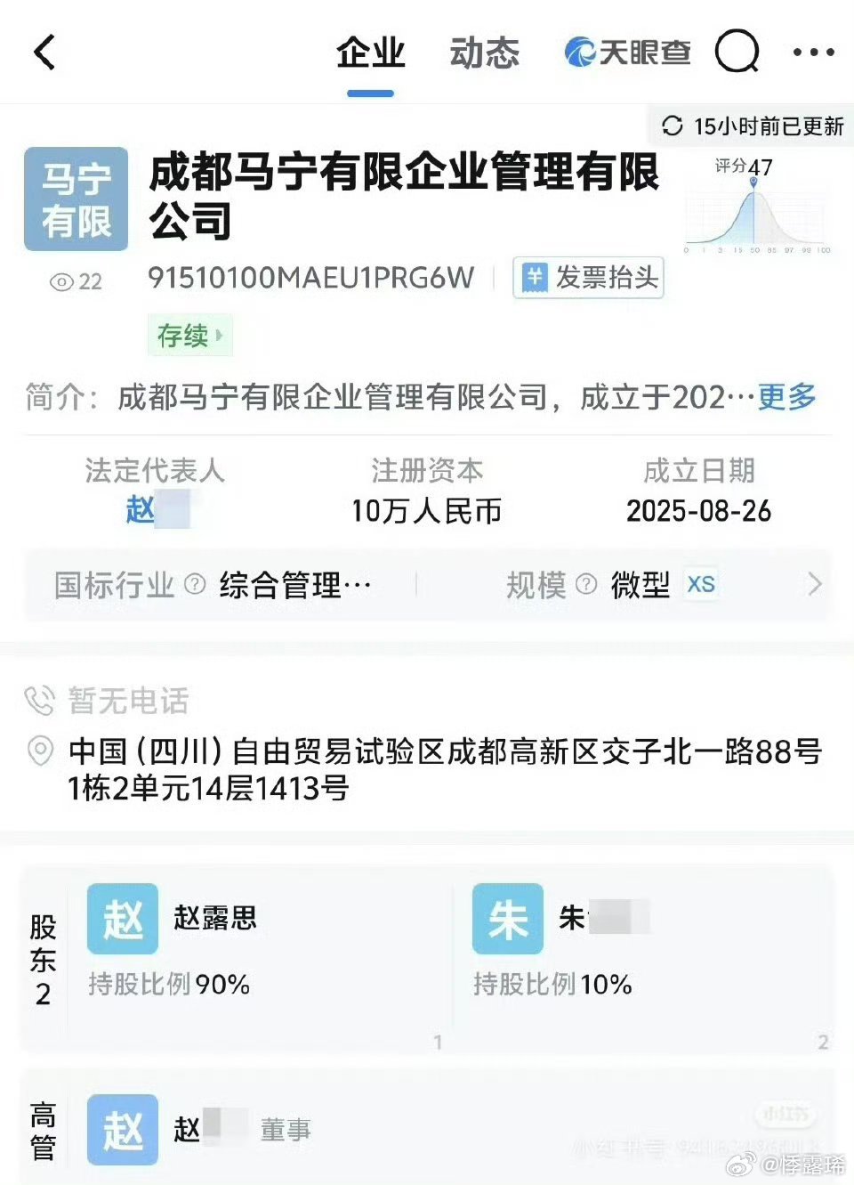 根據陸媒報導,「馬寧有限」註冊資本10萬人民幣,經營範圍涵蓋服飾零售、鞋帽銷售、網路商務等。公司由趙露思父親趙軍擔任法定代表人,而趙露思本人則持股高達90%,堪稱名副其實的「女老闆」。