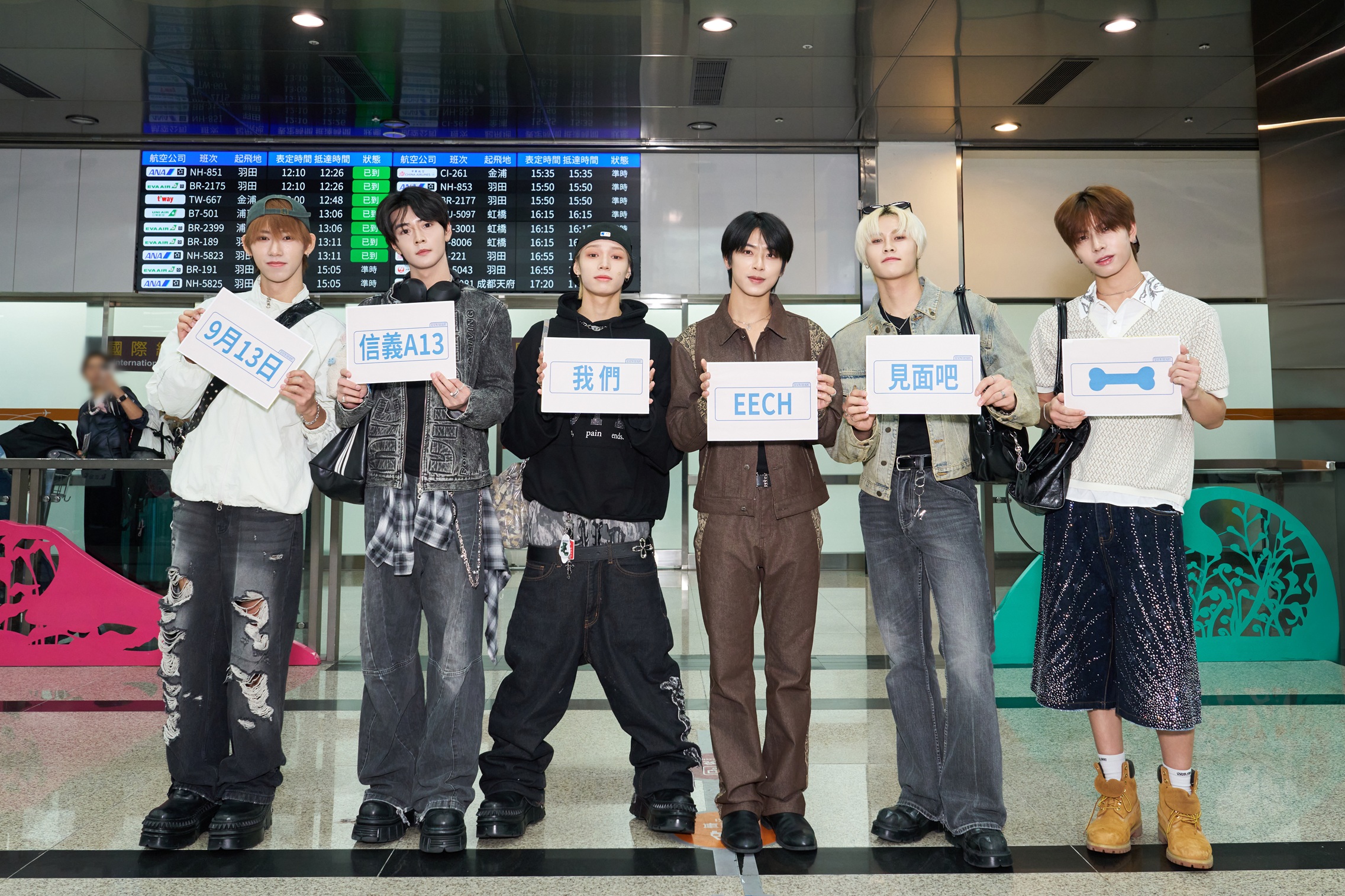 SEVENTOEIGH拋驚喜回贈粉絲接機,帥氣出關舉字牌「9月13日信義A13我們EECH(一起)見面吧!」搶先「劇透」見面會日期釀粉絲高分貝尖叫!為了感謝粉絲的熱情在機場應援,SEVENTOEIGH特別在出關前每人特別備著一張卡片,以字卡「逆應援」方式給粉絲驚喜,只見六人舉著「9月13日信義A13我們EECH(一起)見面吧!」預告接下來將在台北信義區香堤大道辦見面會的活動,讓現場粉絲開心尖叫,高分貝聲量幾乎掀翻機場屋頂!除了每個人事前D.I.Y字卡外,六人還為了與久違的粉絲重逢見面,還特別抽空在韓國小小地shopping買了新衣服,並在上機前梳妝打扮、把自己狀態調整到最好,以嶄新及帥帥的一面現身在粉絲面前,也意外展現出屬於SEVENTOEIGH的「機場時尚」風格!