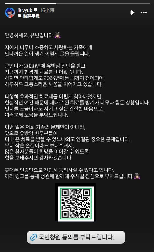 醫界指出,HER2 陽性乳癌患者罹患腦轉移的風險,是 HER2 陰性患者的 1.89 倍,一旦轉移,存活率大幅下降。Tukysa 作為選擇性抑制 HER2 的標靶藥物,能阻斷腫瘤細胞擴散,已於 2023 年底正式獲得韓國販售許可,被視為病患的一線希望。宥斌的公開呼籲立刻引發網友共鳴,許多人湧入留言聲援:「真的希望政府能聽見這個聲音」、「這不只是宥斌的家人,而是所有患者的未來」。大家也期待請願能順利通過,讓更多癌症家庭迎來新的希望。