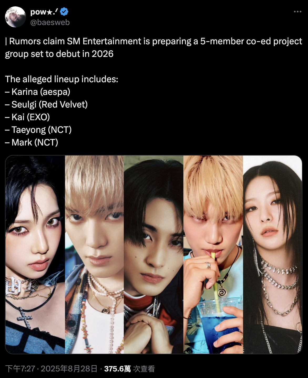根據 X 平台上的一則爆料,SM娛樂規劃於 2026 年組成五人混聲組合,成員包含 EXO Kai、Red Velvet 瑟琪、NCT 泰容、NCT Mark 以及 aespa Karina。該則貼文在短短 5 日內累積超過 375.6 萬次瀏覽,迅速掀起兩派網友的爭論。