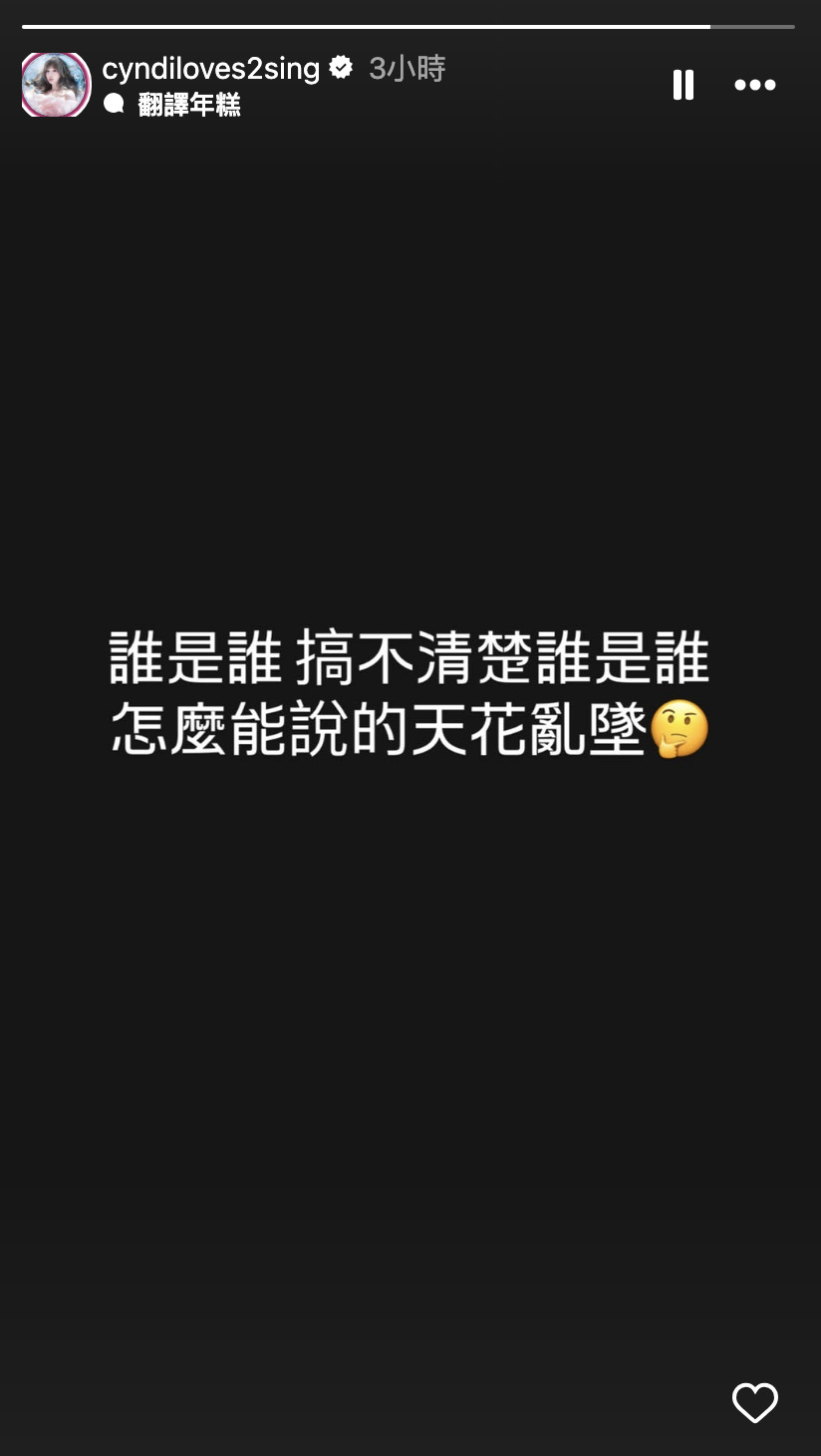除了經紀公司的澄清,王心凌稍早也引用了自己的歌曲〈劈你的雷正在路上〉副歌歌詞,在限時動態寫下19字:「誰是誰,搞不清楚誰是誰,怎麼能說得天花亂墜」,疑似在回應今天爆出的戀愛傳聞。