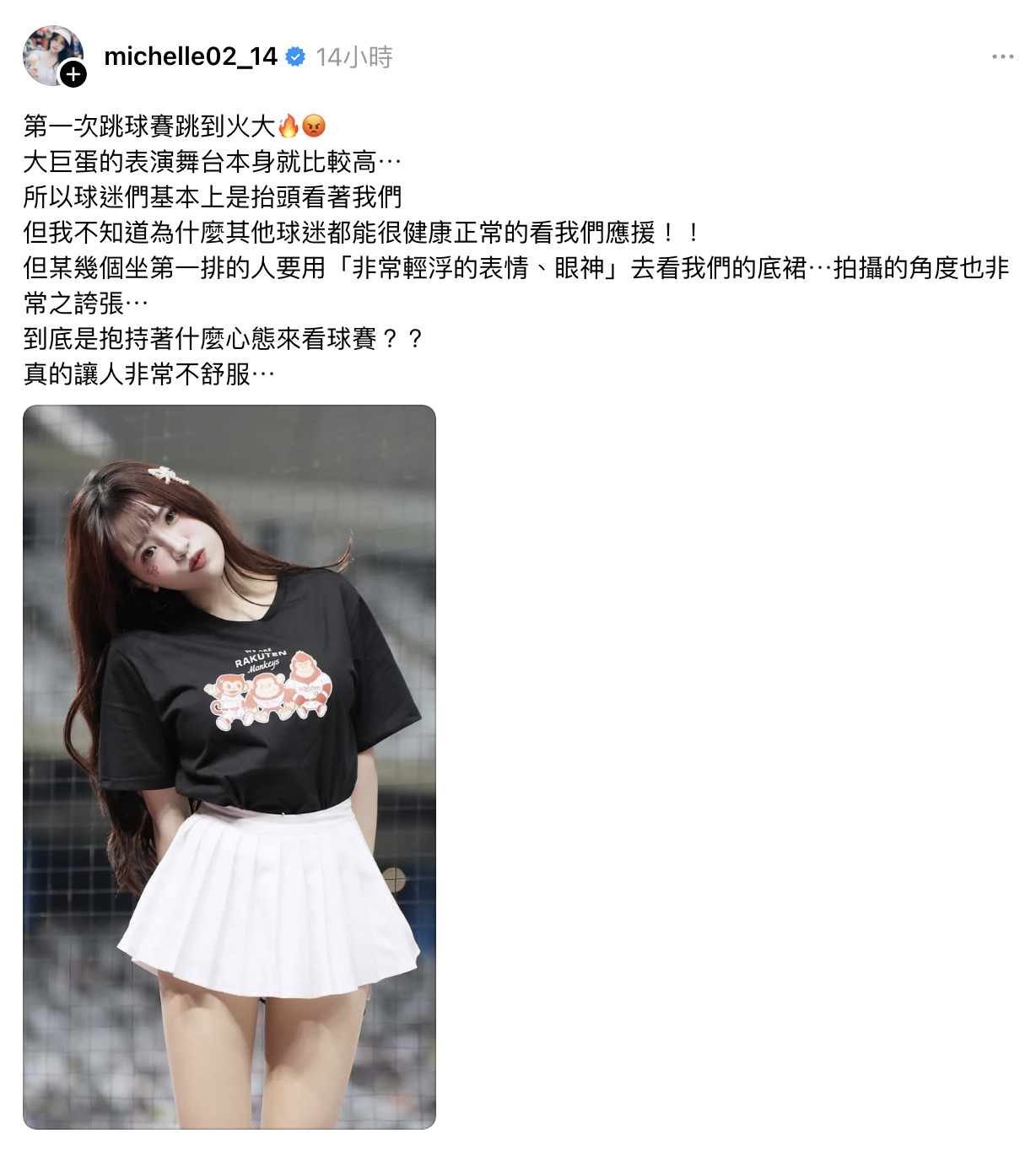 中華職棒樂天桃猿日前連續兩日在台北大巨蛋舉辦主場賽事,吸引眾多球迷進場應援。不過賽後卻爆出不愉快插曲,樂天啦啦隊成員熊霓昨(3日)在Threads發文,罕見動怒表示自己應援時疑似遭前排觀眾偷窺裙底,氣憤喊話:「第一次跳球賽跳到火大」,引發關注。