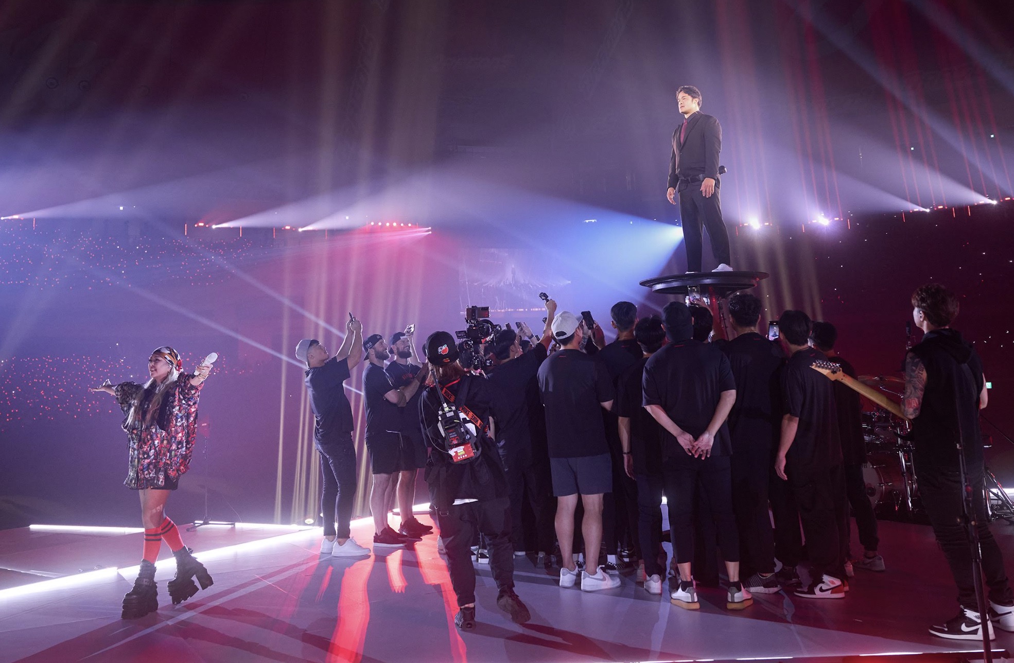 味全龍「大師兄」林智勝引退系列賽進入第2場,在大巨蛋氣氛再度爆棚!賽後重磅邀請天后張惠妹獻唱〈三天三夜〉、〈跳進來〉、〈渴了〉等6首嗨歌,味全龍全隊更一起登上舞台熱舞,林智勝則換上西裝,與隊友們嗨跳同樂。現場4萬名觀眾全場齊喊應援曲,氣氛直衝天花板,連阿妹也忍不住笑稱:「這場引退賽根本是演唱會吧!」