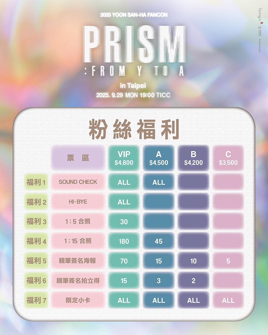 「2025 YOON SAN-HA FANCON [PRISM : from Y to A] in Taipei」將於9月29日(一)在台北國際會議中心舉行,票價為VIP區$4,800 / A區$4,500 / B區$4,200 / C區3,500 / 身障席$2,400,全區對號入座。購票福利為SOUND CHECK / HI-BYE / 限定小卡 / 1:5合照 / 1:15合照 / 親筆簽名海報 / 親筆簽名拍立得等七種,門票於本週日(21日)下午3點20分在KKTIX全面啟售,更多詳情請鎖定主辦單位RICHINING官方社群專頁。