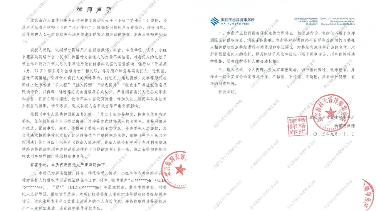 律師楊曙光22日在微博公開律師函,嚴正指出部分網友在社群平台上,將宋伊人過往的生活片段與人際互動進行惡意解讀,並強行與于朦朧酒後墜樓事件聯繫,甚至散布「殺人犯」、「拉人陪酒」、「潛逃國外」、「拉皮條」等不實指控。律師批評這些言論涉及侮辱、誹謗,嚴重誤導大眾,導致宋伊人名譽受損,部分帳號更疑似藉由捏造謠言來博取流量與非法利益,情節惡劣。
