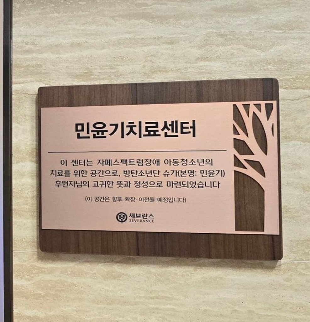 南韓天團 BTS 成員 SUGA(閔玧其) 的愛心實現了!他在今年 6 月豪捐 50 億韓元(約新台幣 1.2 億元) 給首爾延世大學附屬世福蘭斯兒童醫院,如今以他名字命名的 「閔玧其治療中心」 已在 30 日正式揭幕,將為自閉症兒童與家庭打造一個全新希望空間。