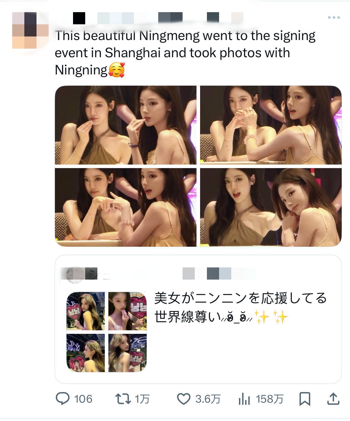 近日,寧寧在簽售會上和粉絲互動時,忍不住讚嘆台下一位長髮粉絲的顏值,之後這位粉絲上台簽名,轉頭對著鏡頭與寧寧合照,當場露出水汪汪大眼、挺鼻與小瓜子臉,仙氣爆棚,甚至還有幾分神似寧寧本人。照片一出立刻在網路瘋傳,推特上瞬間破萬轉發,留言狂刷:「根本雙胞胎感覺」、「美女旁邊還是美女」、「這合照真的太夢幻!」