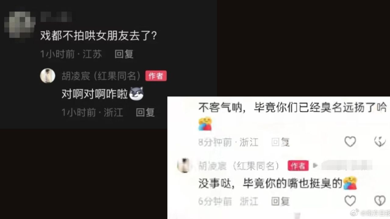 這起「跑路事件」曝光後,立刻讓網友炸鍋,不少人衝到胡凌宸的抖音帳號留言質問:「拋下劇組去哄女友,兩個人鎖死哦?」、「戲都不拍去哄女朋友?」沒想到他不僅毫不否認,還直接回:「對啊對啊,怎麼了?」更在被酸「臭名遠揚」時回嗆:「你的嘴也挺臭的」,火藥味十足,反而讓爭議再升級。