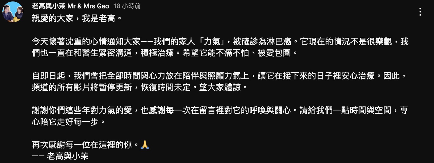 老高在影片中語氣沉重,親自揭露原因是家中毛小孩「力氣」被診斷出淋巴癌,病情不容樂觀。夫妻倆坦言,這段時間全心與醫師討論治療方式,希望能讓牠不再痛苦、繼續感受到滿滿愛意。因為決定把所有心力都放在陪伴狗狗,他們選擇暫停更新影片,並誠懇向粉絲喊話:「希望大家能理解,我們需要時間,也請給我們空間,好好陪伴牠走完這段路。」
