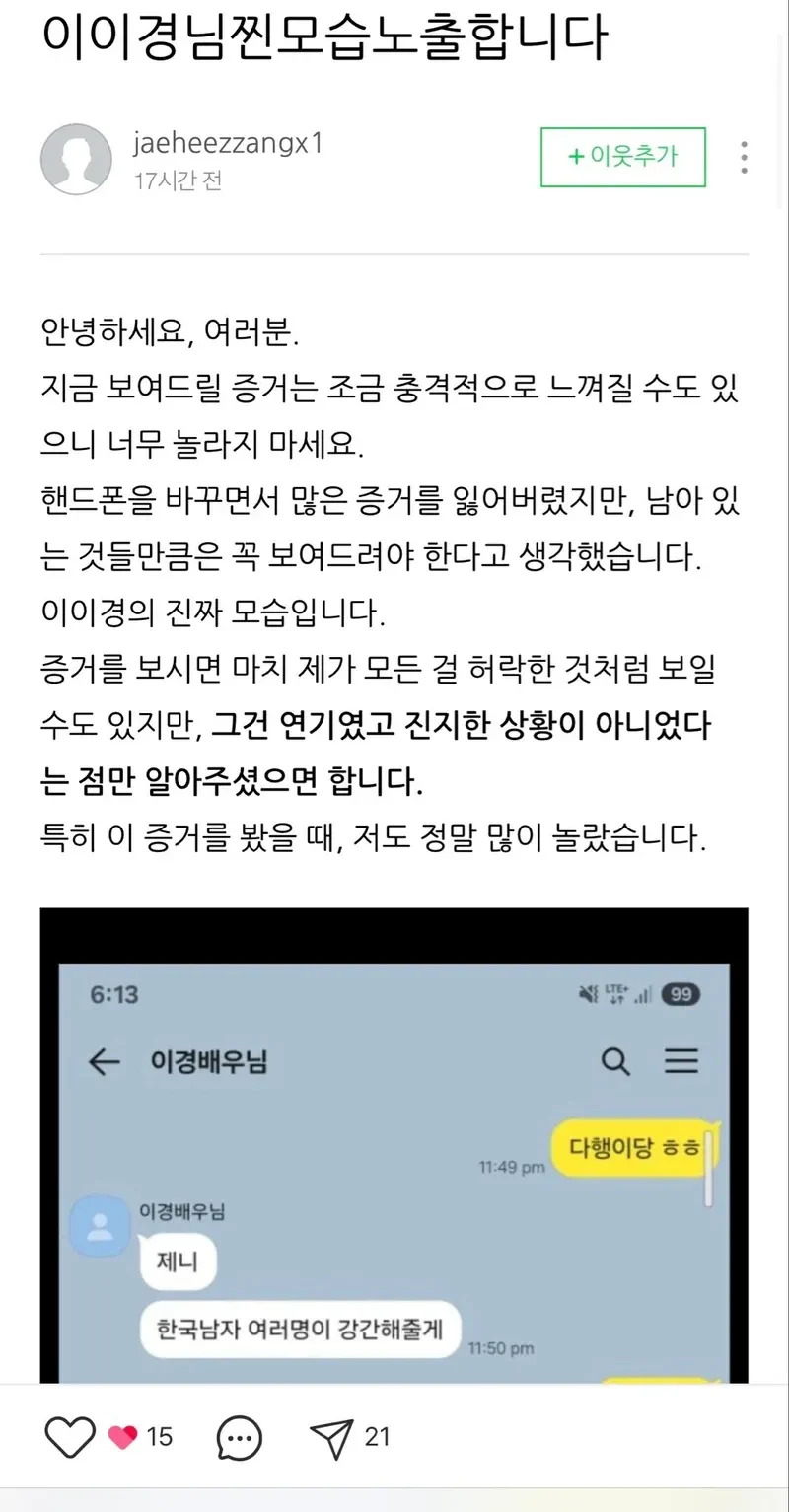 南韓演員 李伊庚 近日驚傳捲入「火辣私訊門」,有網友在論壇聲稱手握他的「私密對話截圖與自拍照」,內容不僅曖昧十足,甚至出現「韓國男人多人XXX」等不堪字眼,讓粉絲全看傻眼。消息曝光後,經紀公司立刻出面滅火,怒斥爆料「完全捏造」,並強調已蒐證提告。