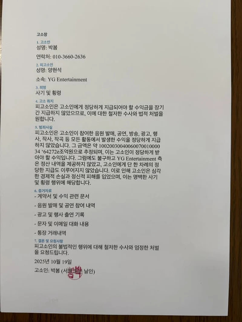 根據韓媒報導,朴春在22日於IG發文寫下:「朴春 hates YG,上網的各位國民,請好好調查YG對朴春做了什麼,謝謝。」貼文同時附上一份她親筆撰寫的控告書,指控梁鉉錫涉嫌「詐欺與侵占」,並聲稱對方未支付她應得收益,金額竟高達「64272e兆韓元」,更令人震驚的是,朴春還在文件中公開了自己的私人手機號碼,讓粉絲擔心她的精神狀況是否出現異常。該貼文上傳後雖一度刪除,但不久又重新上架,讓事件迅速在韓網發酵。