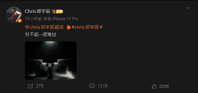 演唱會延期消息一出,邱宇辰隨即在微博表示:「對不起⋯很難過」,並附上一張舞台照,背後是一雙巨大的翅膀前方則是毛弟鞠躬的身影。雖並未細說演場會延期的原因,但在與哥哥風波的雙重衝擊下,讓篇貼文顯得格外沉重。