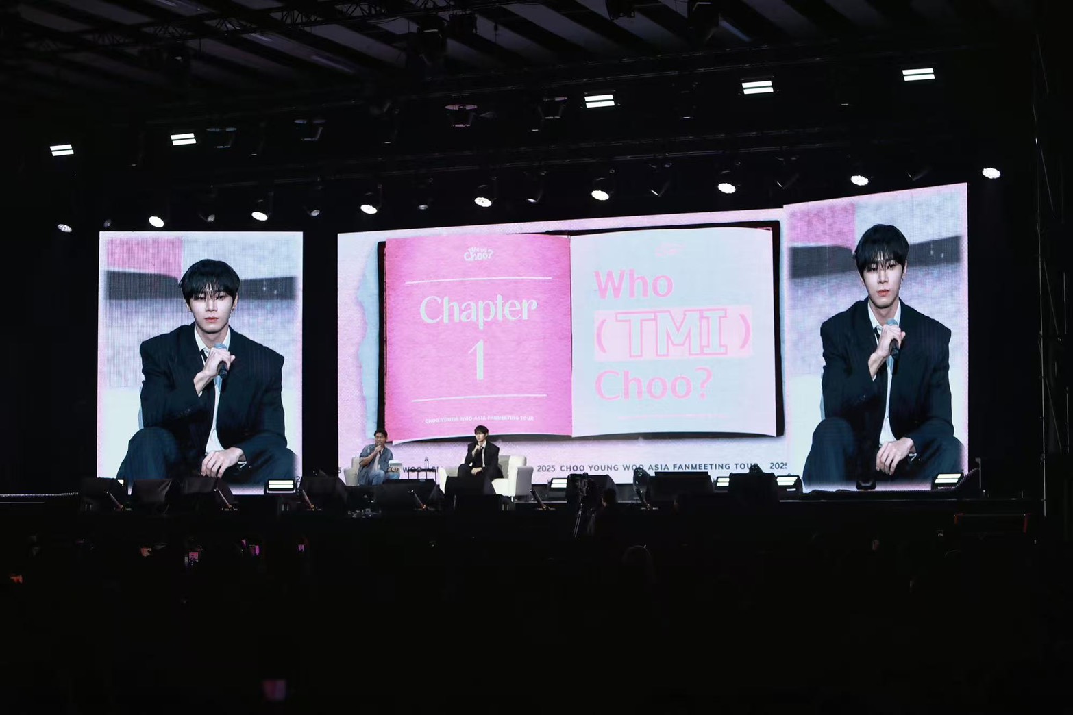隨後在開場訪談中,秋泳愚也表達了首次來到台北的興奮與感動。「第一次來台北非常的期待。」當被問及首次舉辦巡迴見面會的標題<Who (is) Choo?>的含義時,他幽默地解釋:「因為我姓『秋』(Choo),所以先加入了Choo這個字,就像Who is Choo? 這個問句一樣,我想向粉絲們展示更多的面貌。」他更提到,若將中間的(is)拿掉,發音便成了粉絲暱稱「胡椒」。他也用中文甜喊「胡椒!我愛你!」,瞬間融化了所有粉絲的心,展現了極高的親和力與寵粉度。聊到開場演唱的〈那些年〉,他坦言自己很喜歡這首歌,並幽默表示雖然平時在朋友與工作人員面前練唱都很有自信,「但在粉絲面前唱的時候,真的好害羞喔!」反差萌瞬間圈粉無數。