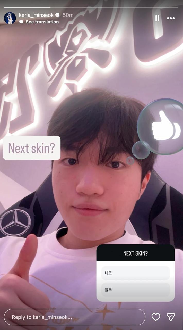 Keria過去兩年的冠軍造型,分別選擇了自己拿手的「巴德」與「派克」,今年再度奪冠後,他馬上在社群上發起二選一投票:「妮可」vs「露璐」,直接引爆討論!截至截稿前,妮可以壓倒性的81%支持率遙遙領先,粉絲一面倒狂喊「就是妮可沒錯!」、「拜託鎖妮可,太經典了!」留言區瞬間淪陷。