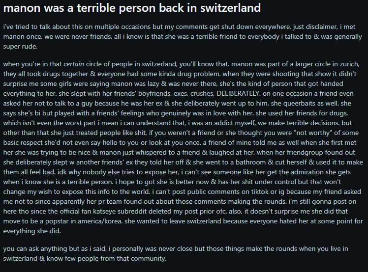 該網友聲稱,Manon 曾「勾引朋友男友」、同時自稱雙性戀卻玩弄女性朋友的感情,被批是「queerbaiting(誘導式雙性向行銷)」。甚至爆料她曾在被質疑後以自殘博取同情,狠嗆:「她只是想靠出國出道擺脫過去罷了!」