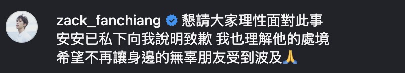 這篇貼文釋出後,粿粿的丈夫范姜彥豐也在底下留言表示:「懇請大家理性面對此事,安安已私下向我說明致歉,我也理解他的處境,希望不再讓身邊的無辜朋友受到波及?」