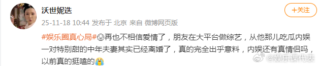 事件起於微博娛樂博主「娛樂課代表」近日轉發一則爆料,內容寫道:「一對特別甜的中年夫妻,其實已經離婚了。」消息來源據說是「在大平台做綜藝」的朋友,爆料者更直言「真的完全出乎意料,以前真的挺甜的」雖沒有指名道姓,但卻丟下一顆大型煙霧彈,讓網友瞬間炸鍋。