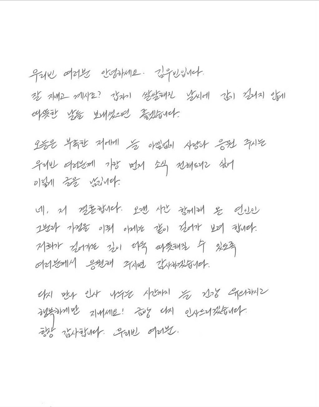 金宇彬今日透過官方粉絲團公開親筆信,他寫道:「想最先告訴一直給我愛與支持的大家……是的,我要結婚了。」字句間滿滿的誠懇與幸福。他提到決定與「長久陪伴在身邊的那位」攜手共度人生的決定,也希望能得到粉絲祝福。經紀公司 AM Entertainment 也隨即證實喜訊,表示兩人以多年深厚感情與信任為基礎,最終決定成為彼此的終身伴侶。婚禮僅邀請雙方家屬與親友低調舉行,不對外公開。