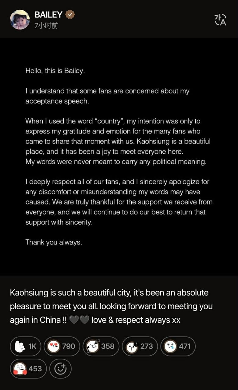 Bailey 發出黑白聲明強調自己完全沒有政治意圖,並且只是想表達感謝粉絲與活動的感動時刻。她也再次讚嘆「高雄真的很美」,並向所有可能被影響到的人致歉,希望能平息風波。不過他在貼文末尾加上一句「期待在中國再次與你們相見」,讓解讀空間瞬間打開,有人覺得是外交手腕。