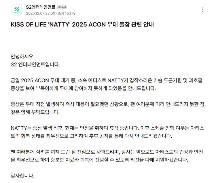 南韓 ACON 音樂節昨日(7日)延續AAA頒獎典禮在高雄世運狂熱登場,人氣正旺的 KISS OF LIFE 原本被視為下半場最辣亮點,沒想到明明下午彩排還有出現的 Natty,在晚上的表演舞台意外失蹤,讓許多粉絲相當震驚!今日稍早經紀公司發出聲明表示 Natty 昨天因突發性心悸與過度換氣,不得已取消上台。因此沒能及時向粉絲告知非常抱歉。