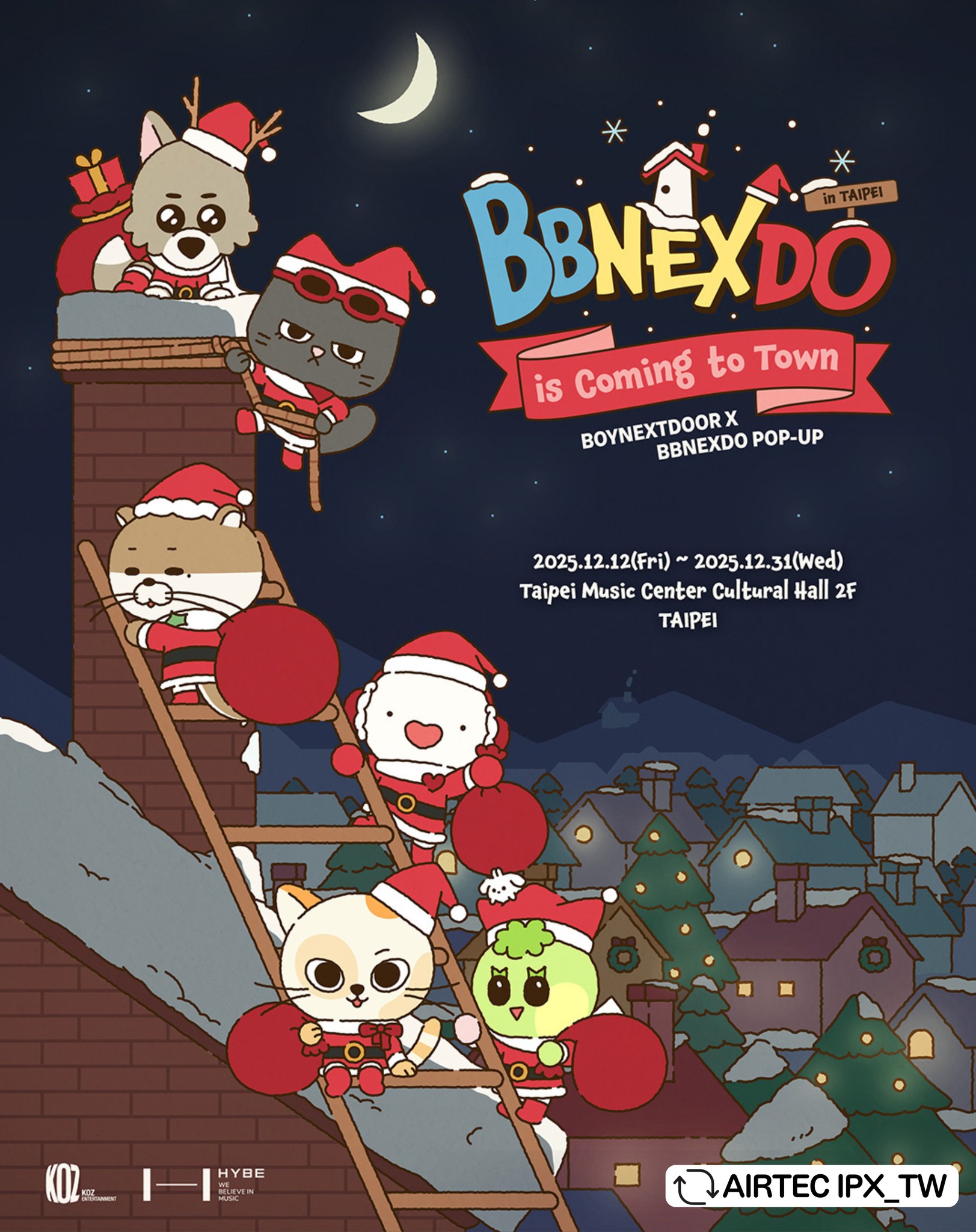 韓國大勢男團BOYNEXTDOOR官方角色「BBNEXDO」第二次快閃活動即將抵達台北,自 12 月 12 日至 12 月 31 日止,於台北流行音樂中心文化館2樓戶外天橋設立快閃店「BOYNEXTDOOR X BBNEXDO POP-UP ‘BBNEXDO is Coming to Town’ in TAIPEI」,和粉絲們共度聖誕與新年佳節!