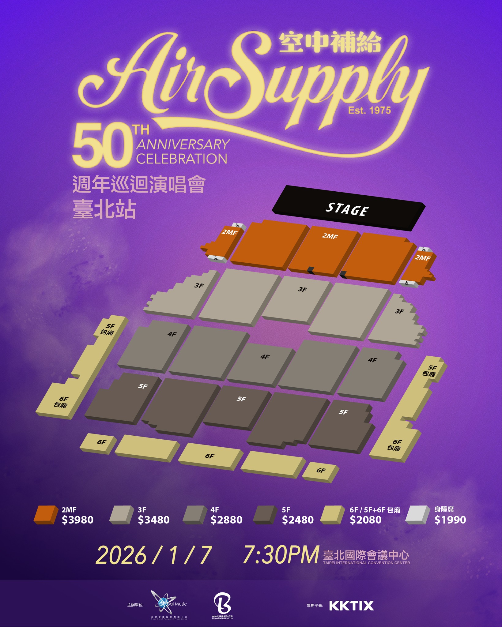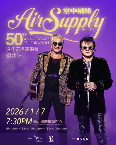 被譽為「西洋樂壇長青樹」的柔情搖滾經典傳奇樂團-空中補給合唱團(Air Supply)再添音樂生涯里程碑,適逢2025年成軍滿50周年,Air Supply同步啟動新專輯及全新巡演計畫,宣布將於明年1/7登上台北TICC舉行《空中補給50週年巡迴演唱會》臺北站的演出;成團至今多次訪台的他們堪稱是最愛的台灣的西洋「灶咖天團」,不僅是臺灣演唱會史上第一組來台演出的西洋流行歌手,更創下成團至今來台開唱超過17次超級紀錄!被樂迷封為「台灣之友」的Air Supply每次訪台都創下銷售佳績,多重記錄更無人能敵,此次再度回歸舞台,將以一首首跨越半世紀的經典金曲,與臺灣歌迷共度最浪漫動人的 50 週年音樂夜。