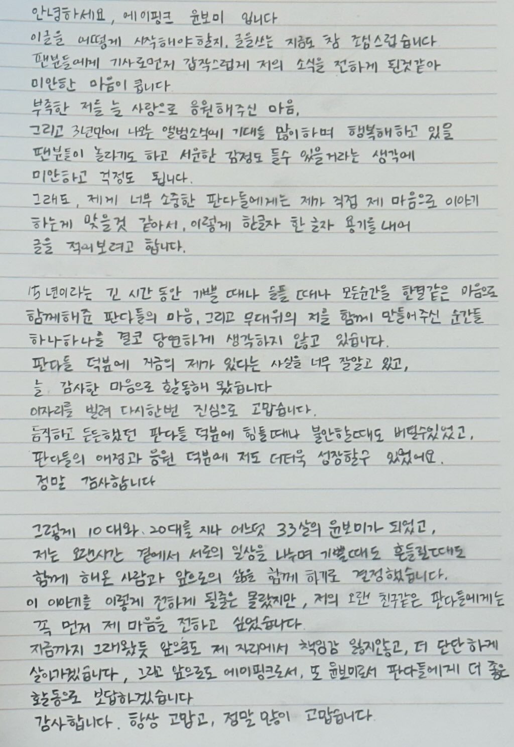 她坦言,沒想到有一天會以這樣的方式向大家傳達消息,但仍希望第一時間親口告訴一路陪伴自己的粉絲,也承諾未來會繼續在自己的位置上,不失去責任感,努力成為更堅強的人。無論是以 Apink 成員的身分,或是作為「尹普美」本身,她都會用更好的作品回報大家的支持,信中更多次道謝,誠意滿滿。
