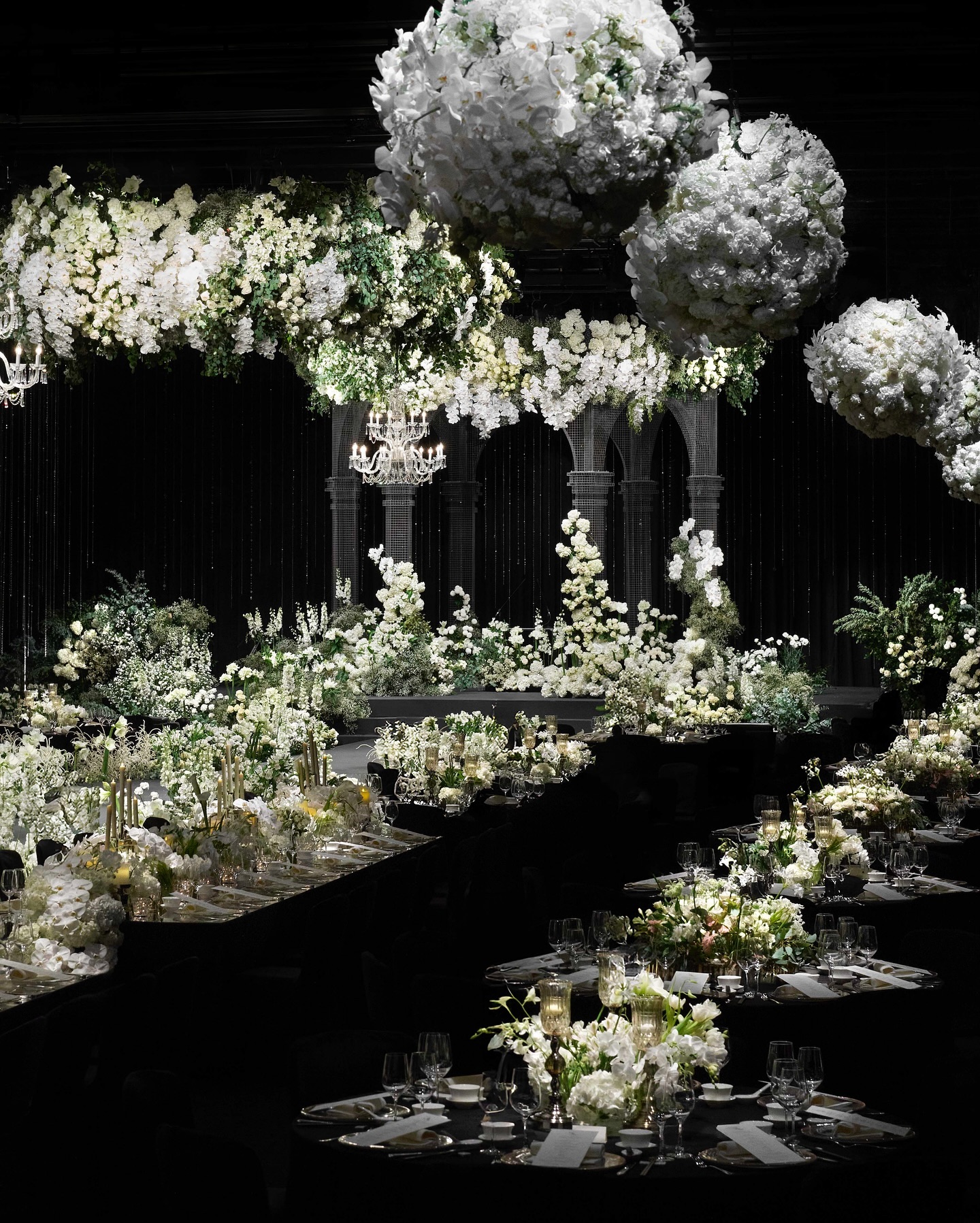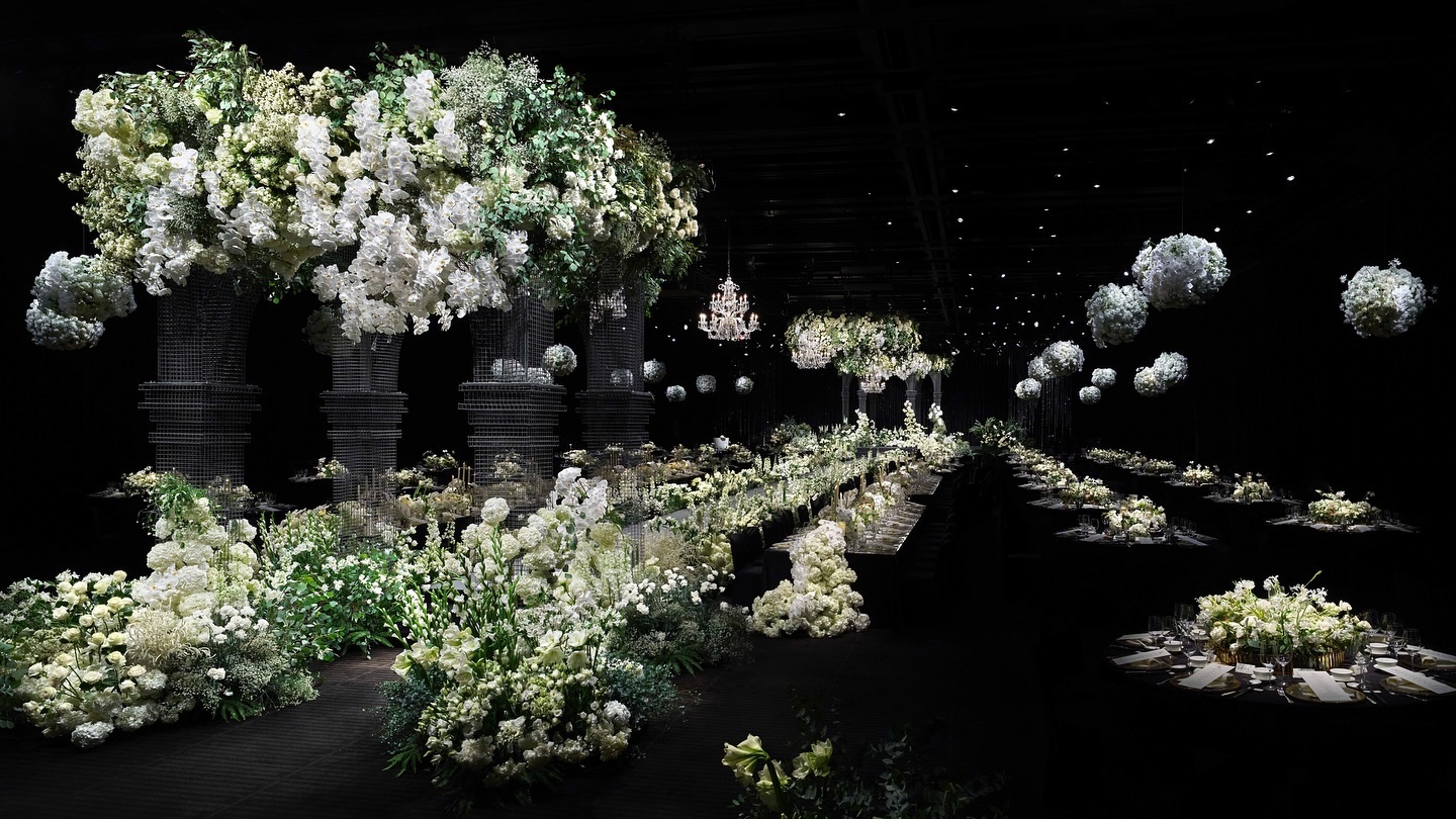從新羅飯店官網曝光的內部照片可見,婚禮現場宛如高級宮廷宴會。整體以純白與象牙色為主調,營造出優雅又氣勢十足的氛圍,天花板垂掛層層水晶吊燈,燈光灑落間折射出細碎光芒,宛如點點星光,吊燈上方還點綴滿滿鮮花,彷彿被花海包圍,讓整場婚禮宛如童話般浪漫又夢幻。