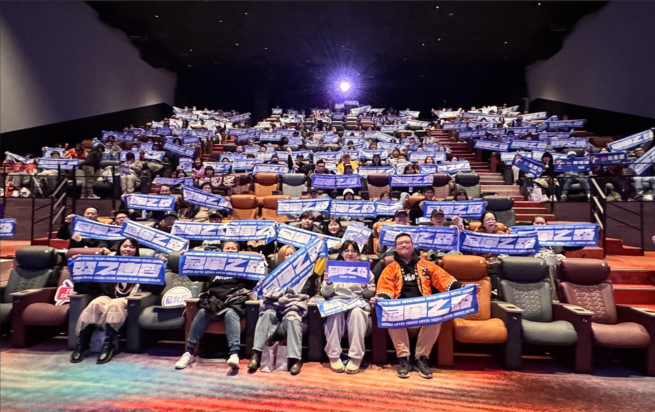 創下「臺灣影史紀錄片首日票房新高」的紀錄片《冠軍之路》,上映首日戲院滿座率超過9成,於昨(1)日早上在大巨蛋秀泰影城舉辦「元旦應援場」,現場有爸媽帶著小孩、孫女帶著爺爺一起應援,有球迷穿著球隊球衣配上帽子、毛巾、球隊娃娃、法批等應援物進場力挺,也有人帶著「世界棒球12強臺灣冠軍全隊紀念簽名毛巾」一起回憶這場令全臺人民難忘的精彩賽事,影迷自爆不小心哭太慘,把簽名毛巾拿來拭淚。放映過程中,觀眾隨著應援聲揮舞加油棒,跟著節奏齊聲高喊:「再來一個好球,三振他!」讓戲院瞬間化身球場看台,熱血程度破表。「從全民運動,變全民電影」,許多影迷看完片後紛紛在社群平台分享現場狀況,直言廳內啜泣聲此起彼落,時不時又被球員黃恩賜婚禮延期一事逗到破涕為笑。觀眾在社群平台寫下觀影心得「才看三秒就哭了」、「2026第一天哭到眼睛腫」、「明明知道比賽結果,還是能感受到緊張跟激動的情緒」、「12強賽事已經看了很多遍,本來以為不會哭,結果完全撐不住」,其中臺灣隊長陳傑憲和中職球星張奕旅日的打拼生涯與經歷,更是讓球迷在座位上淚崩。