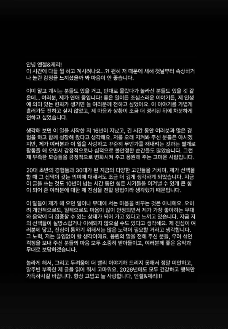 創造透過 IG 限時動態發表長文,開頭先是向粉絲「ANGEL」致歉,坦言在新年一開始就帶來這樣的消息,擔心讓部分粉絲感到錯愕甚至受傷。他表示,或許有些人早已有所察覺,也有人完全沒想到,但無論結果是好是壞,他都希望能親口向粉絲說明,而不是讓消息在不清楚的情況下被傳開。