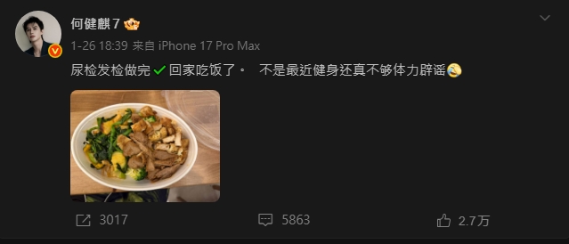 何健麒本人也於 26 日在社群曬出便當照,幽默回應爭議:「尿檢髮檢做完,回家吃飯了。不是最近健身還真不夠體力闢謠」,以行動證明清白,表現出對工作與名譽的積極態度,讓粉絲感受到他的真誠與努力。