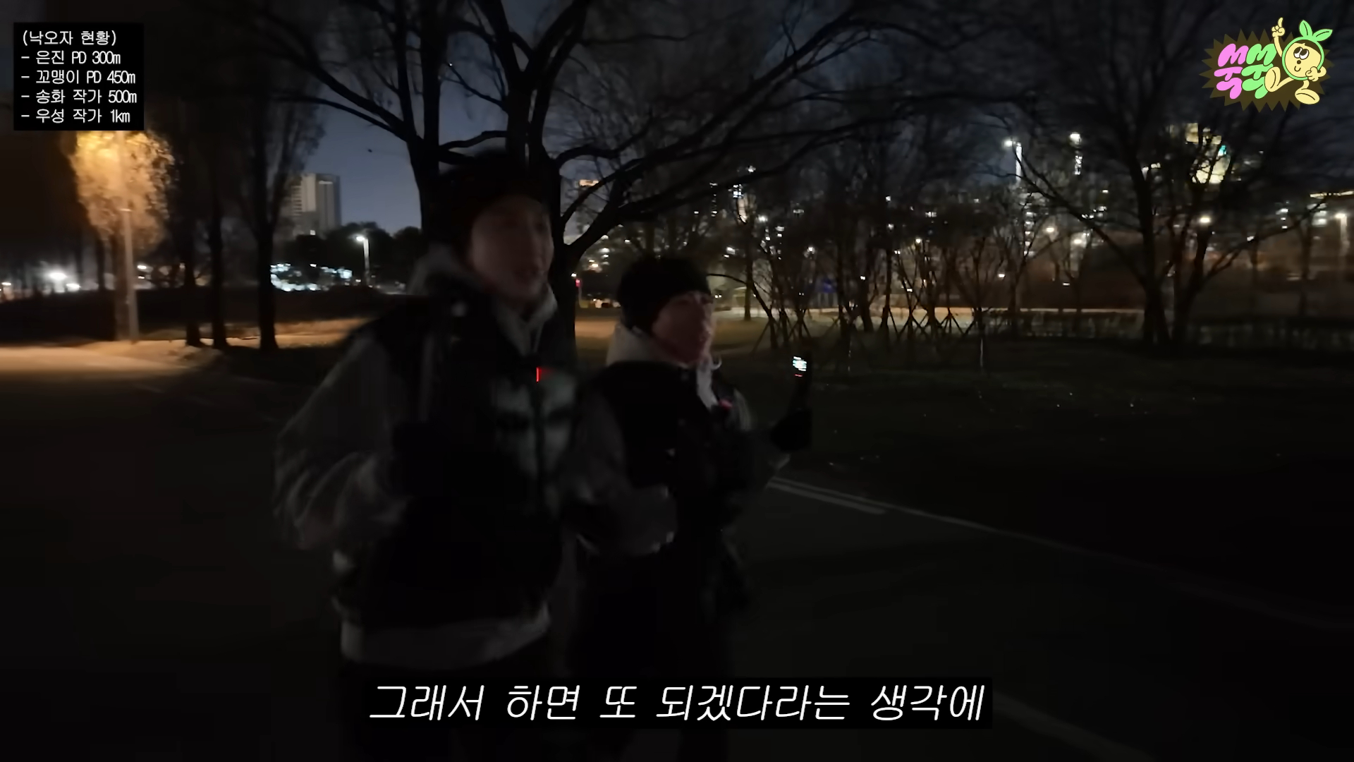 第一位出局的是趙恩珍 PD,只跑了大約 300 公尺,就假裝在後方拍攝後悄悄消失;接著忙內 PD 在 450 公尺宣告退賽;金松花作家則撐到 500 公尺就投降,三人乾脆一邊散步一邊聊天,還悠哉討論要不要去喝咖啡,完全沒有想跟兩位主持人跑完全程的意思。才跑了短短幾百公尺,製作組就紛紛喊全身痠痛,最後 6 人裡只剩 1 名工作人員繼續全程跟拍,場面荒謬又真實。